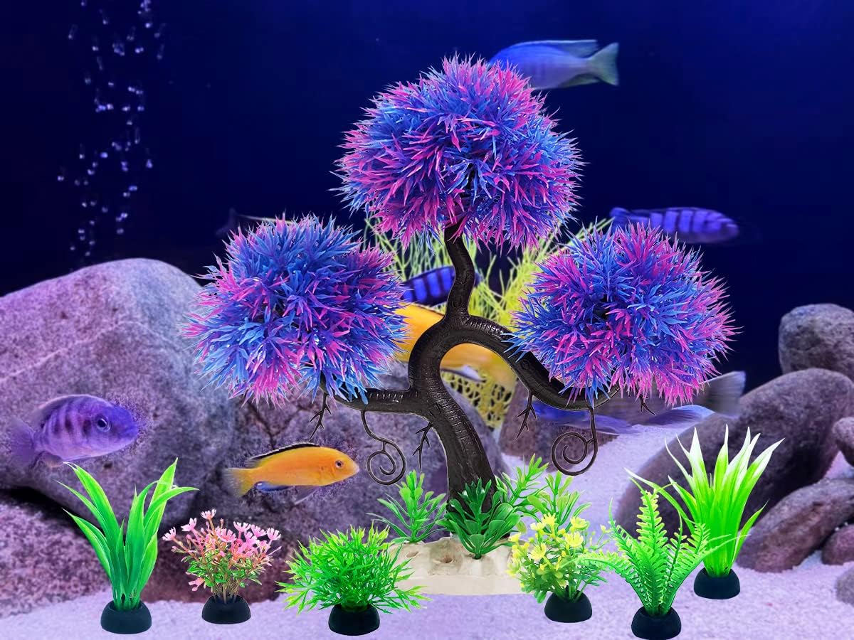 the size of purple tree is 3.3″ x 9″ and other small plants are 2″ or 3.1″ in height. The aquarium plants set are ideal for 5 gallons tanks.