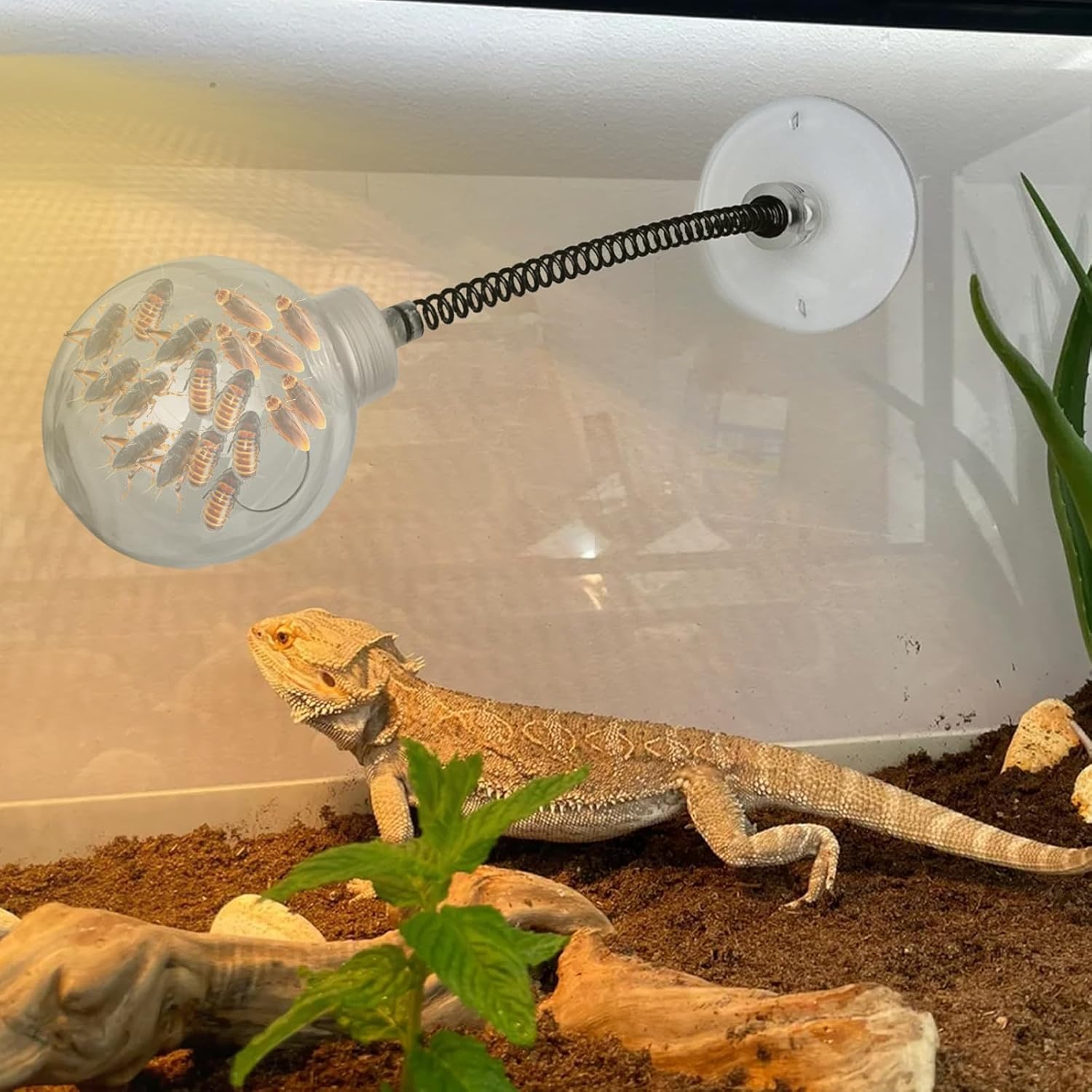 Unique Design-reptile feeder ball made of transparent plastic ball, which is lightweight and safe. Metal spring is support swing left and right with suction cup. Bearded dragon feeder will swing when the reptiles are foraging, fun way to get food