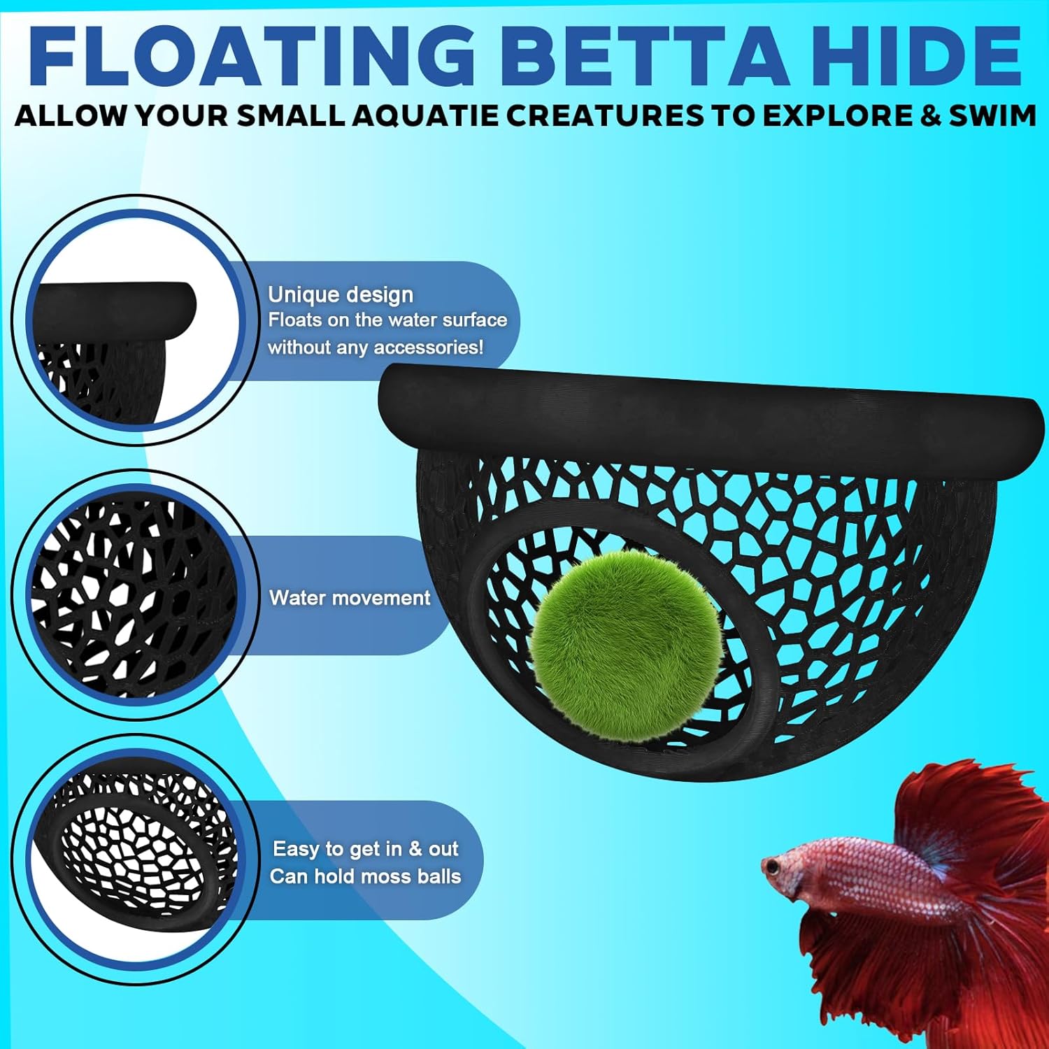 🏝️ All-in-One Design for Bettas & Shrimp: Combines a floating cave, fish hammock, and built-in feeding ring—now featuring our U.S. Patent Pending technology for enhanced aquatic enrichment.