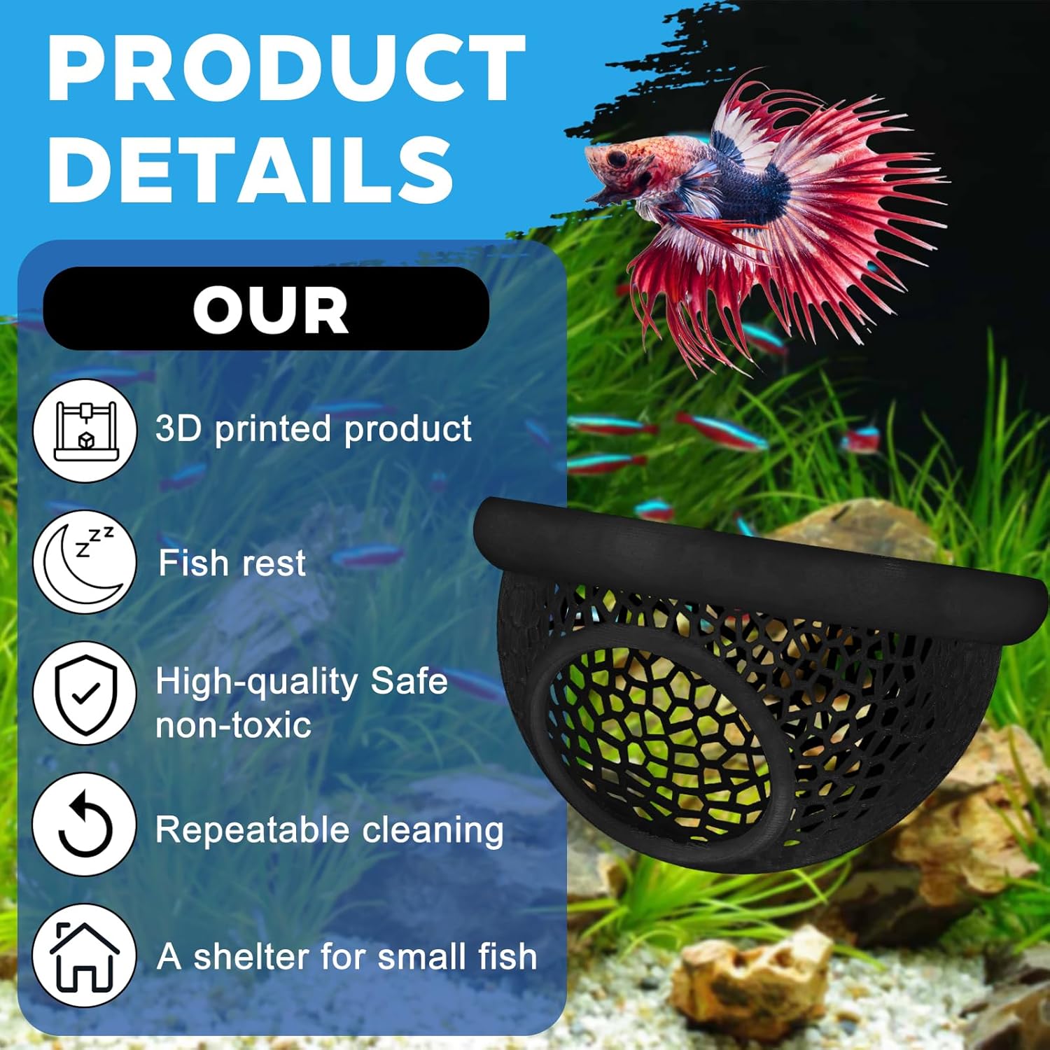 🌱 Eco-Safe 3D Printed Material: Made from non-toxic, aquarium-safe PLA. This eco-friendly, durable design ensures water quality is preserved in all tank types.