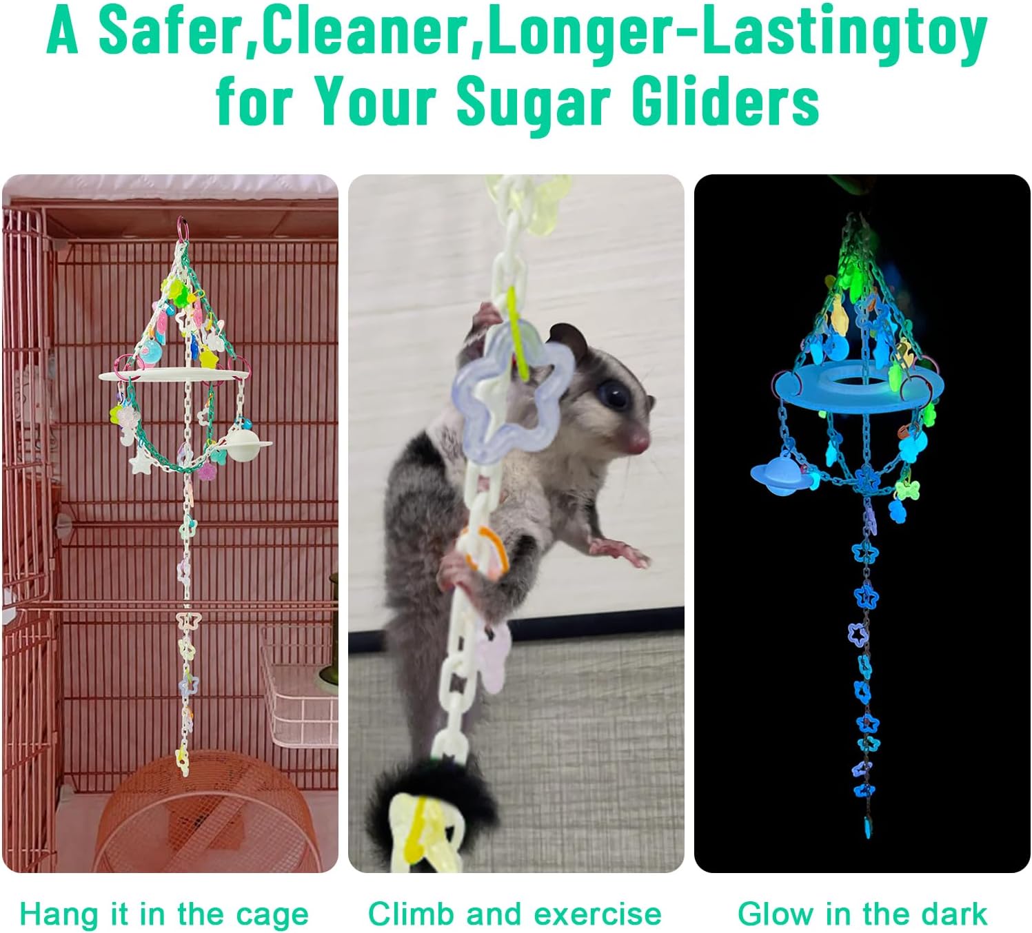 Climbing and perching suitable:The design and structure of the climbing toy chain are specifically crafted for the climbing habits of sugar gliders. The chain provides excellent grip and support, while the central disc serves as a resting platform, allowing sugar gliders to climb and hang easily. This satisfies their physical activity needs and helps keep them active.