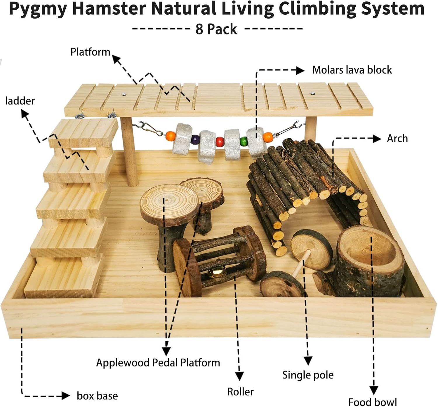 Hamiledyi Dwarf Hamster Activity Playground Natural Wood Gerbil Climbing Platform Mice Living Gym System Set Syrian Exercise Cage Accessories with Lava Stone String Chewing Toy Ladder Bridge Ramp