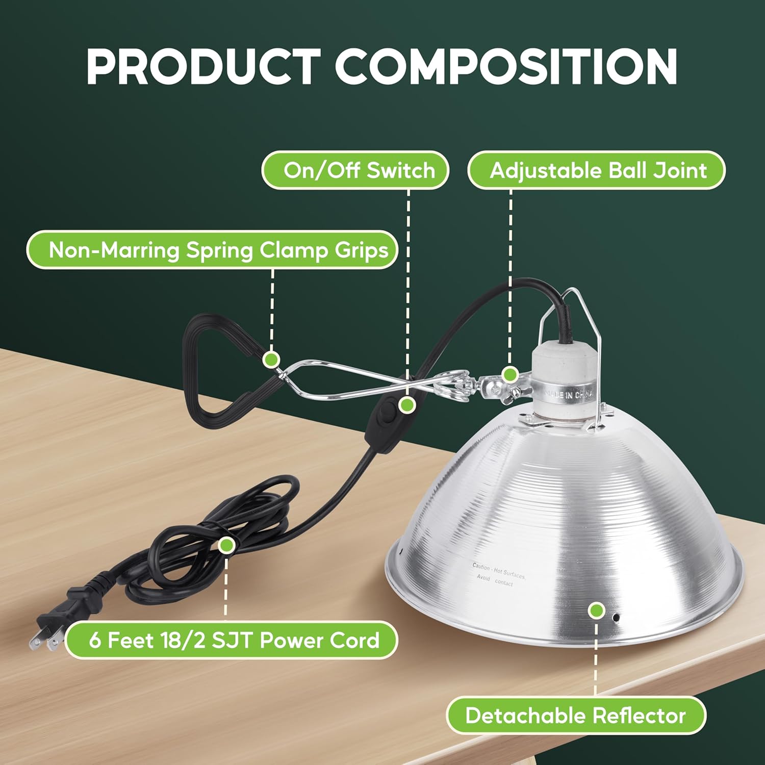 HealSmart 10.5″ Clamp Light Socket and Bulb Guard, 250-Watt Maximum with 6 Feet 18/2 SPT-2 Cord, Aluminum Reflector E26 (no Bulb Included), for Reptiles and Plants Growing, 2-Pack