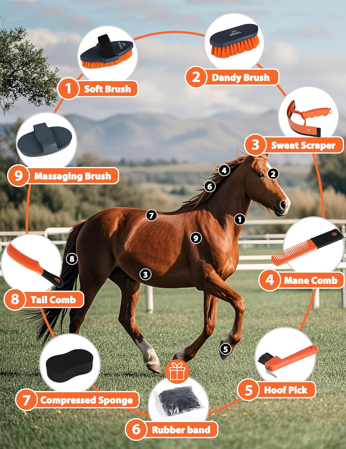 Complete 8-Piece Kit: Includes all essential grooming tools: dandy brush, soft brush, massaging brush, sweat scraper, hoof pick, mane comb, tail comb, and a compressed sponge—plus a rubber band pack for mane and tail styling.