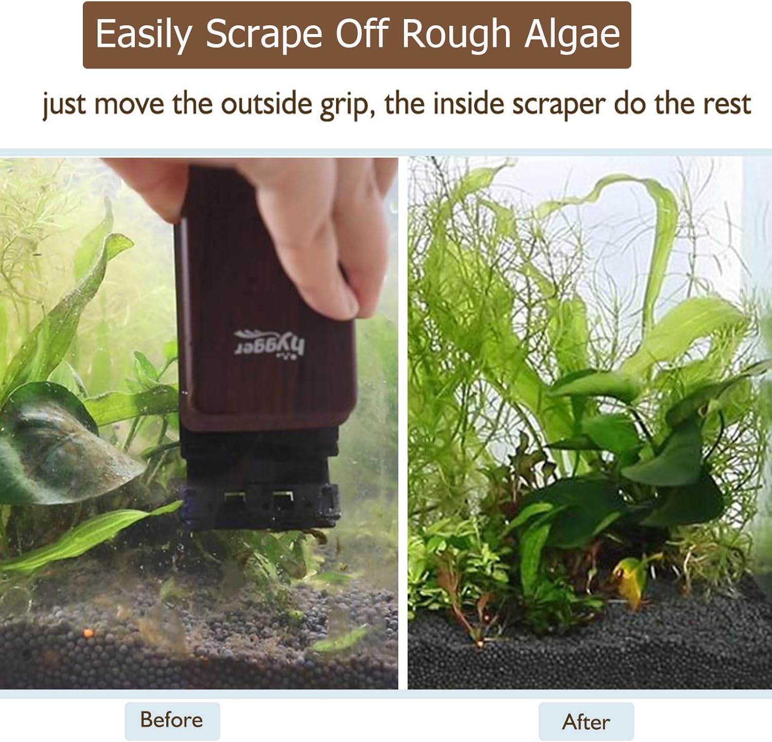 Powerful Magnet – hygger Aquarium Magnet Cleaner carries so strong magnetism that it sticks tightly on the glass not fall off. This smooth, curved wood-like finish grip is ergonomically designed so it’s comfortable to use and let’s you dig in and get the tough spots. The scrubbing pad is covered in hook, velcro-like fabric along with blade to scrape off tough stuff grows on glass