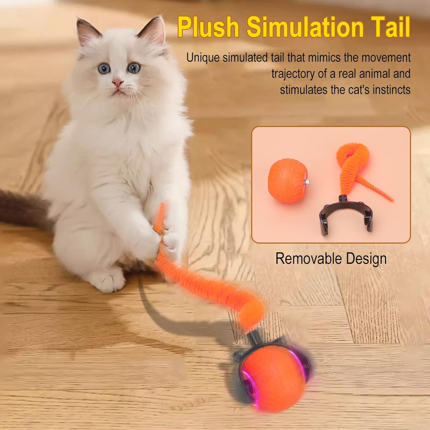 【Fun & Engaging Design】With LED lights and a detachable tail accessory,this automatic cat toy mimics the movements of real animals to captivate your cats’ curiosity and spark their hunting instincts.Its intelligent design and long-lasting interactive features make it the perfect indoor play companion for cats and dogs!