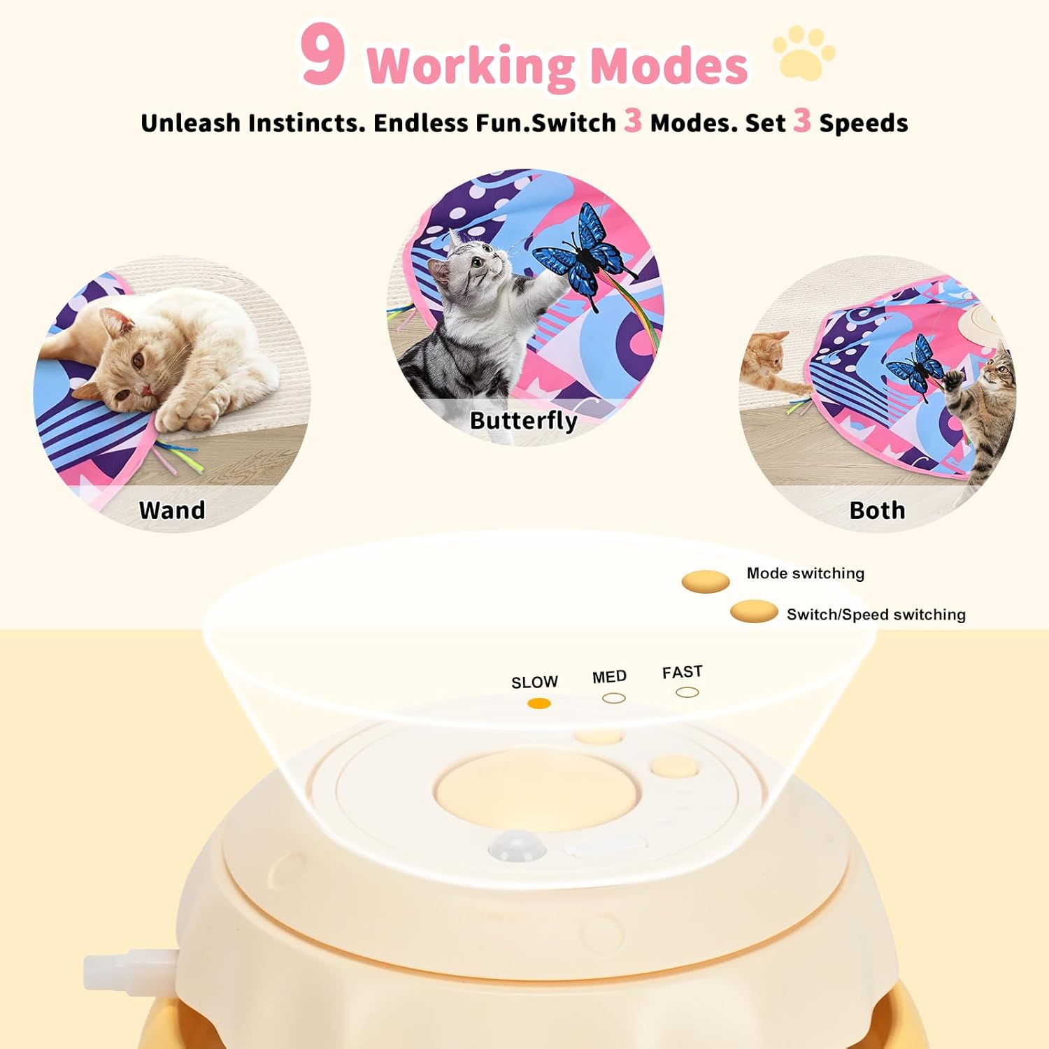 【24/7 Support & Full Accessorie】1.You can directly contact the 24-hour service to solve the problem; 2.English user manual*1; Colorful cloth cover*1;Cloth strip cat teaser stick*1;Butterfly Cat Teasing Stick*2;Base * 1; USB Charging cable * 1