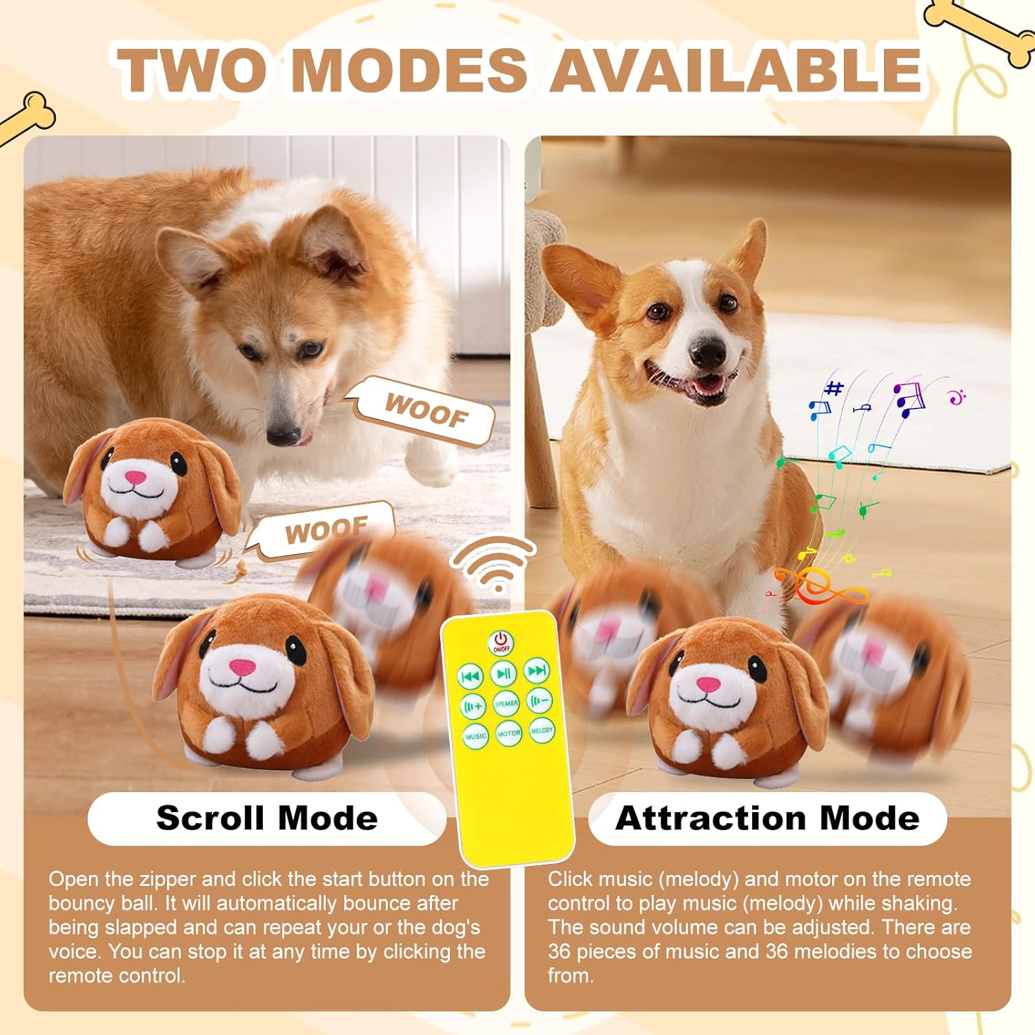 🐶【Remote Control dog Toy】The remote control of the Squeaky Dog Toys has three modes: bouncing, singing and recording talking. You need to activate “Brown Puppy” before using the remote control: unzip the zipper behind the interactive dog ball, take out the bouncing ball, and click the on/off button to activate “Brown Puppy”.