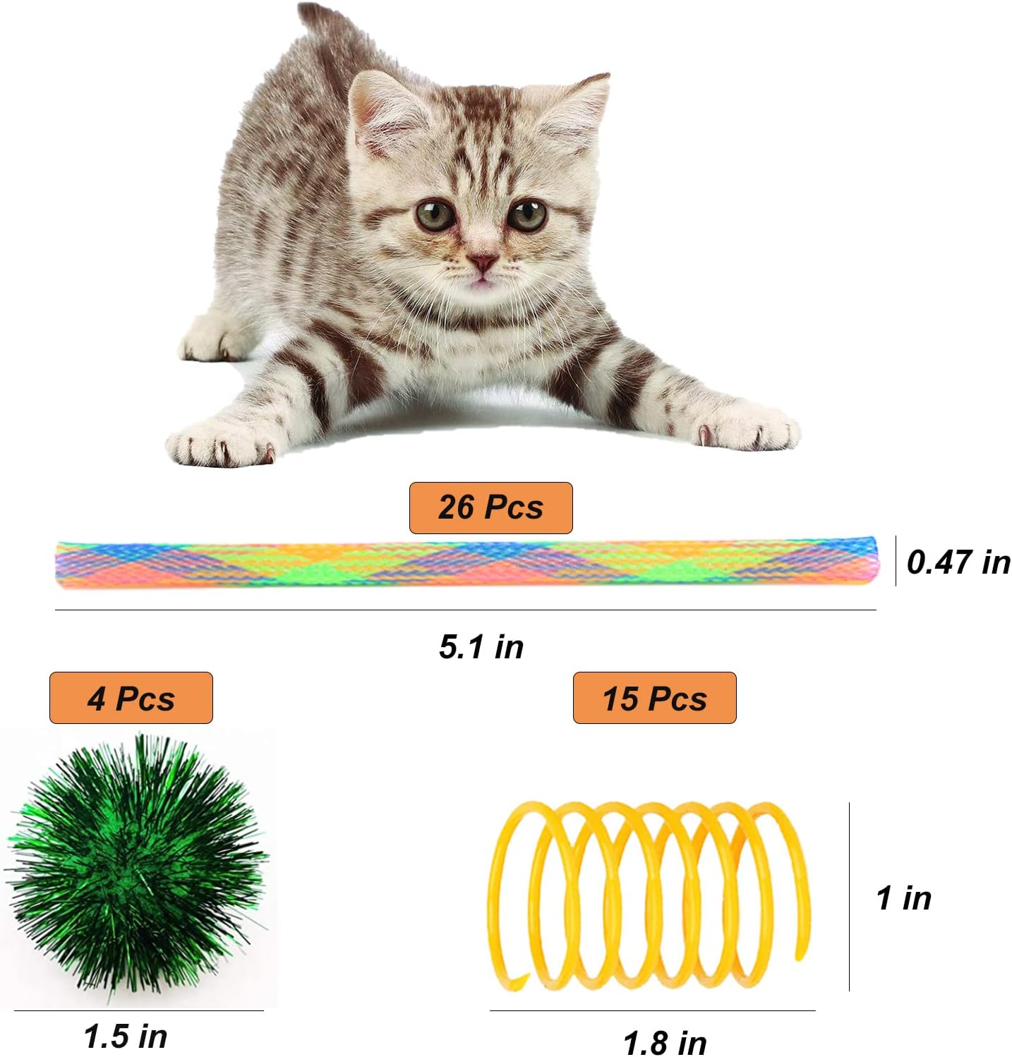 Product Specifications Cat Springs: Made of ABS, BPA-free. Pom Balls: Made of high elastic silk plush. Safe & Reliable Materials Cat Toys for indoor Cats Kitten Toys for indoor Cats Help Cats Stay Exercised and Healthy Ideal present for Cats 45pcs kitten toys include:
