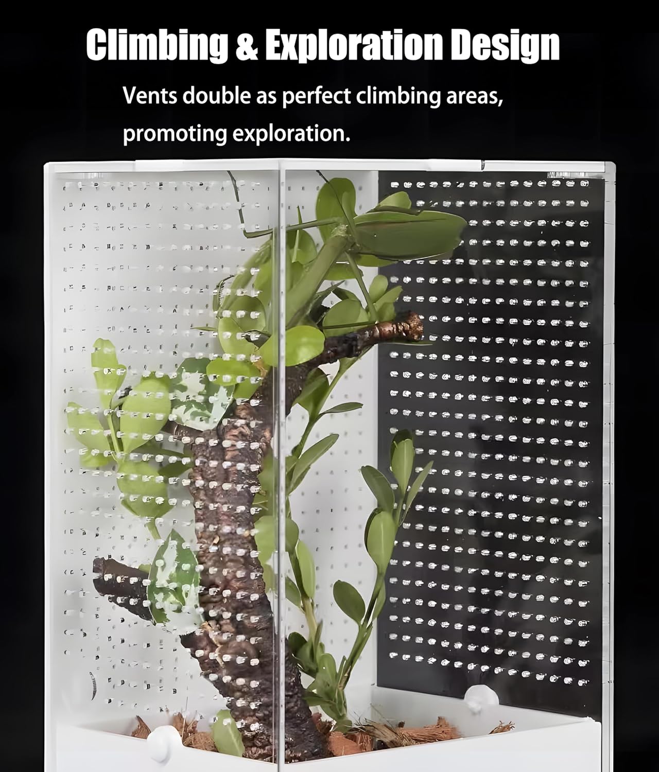 2. **Climb & Observe**: Our enclosures feature climbable vents and sturdy top netting, encouraging the natural climbing and exploratory instincts of pets like mantises and spiders. This setup aids their physical development and supports important activities like molting. Highly transparent acrylic panels allow you to vividly observe every fascinating detail of your pet’s activities.