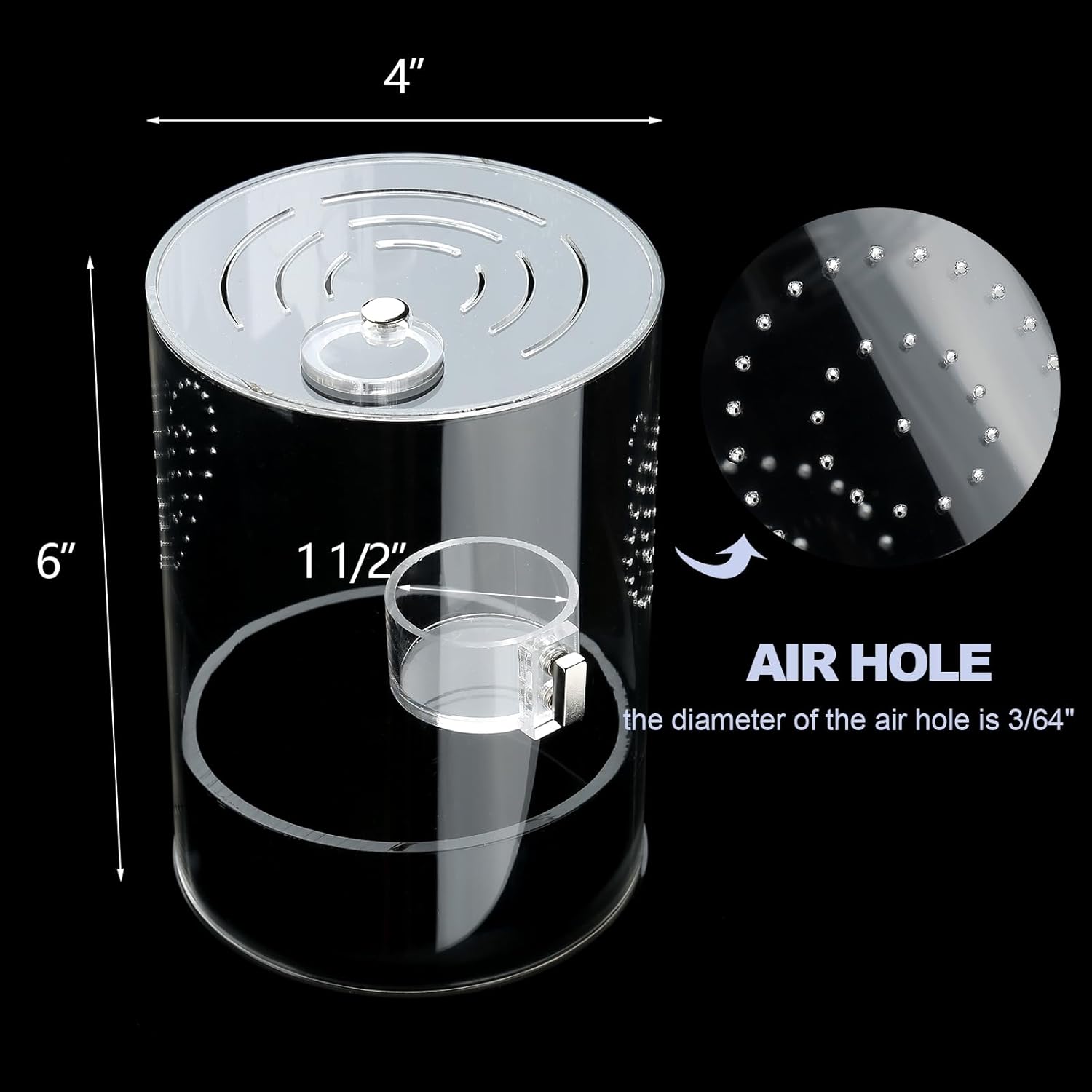 Product size is 6”*4”*4”, the diameter of the air hole is 3/64″, suitable for jumping spiders, the top has a feeding hole and can be opened and closed.