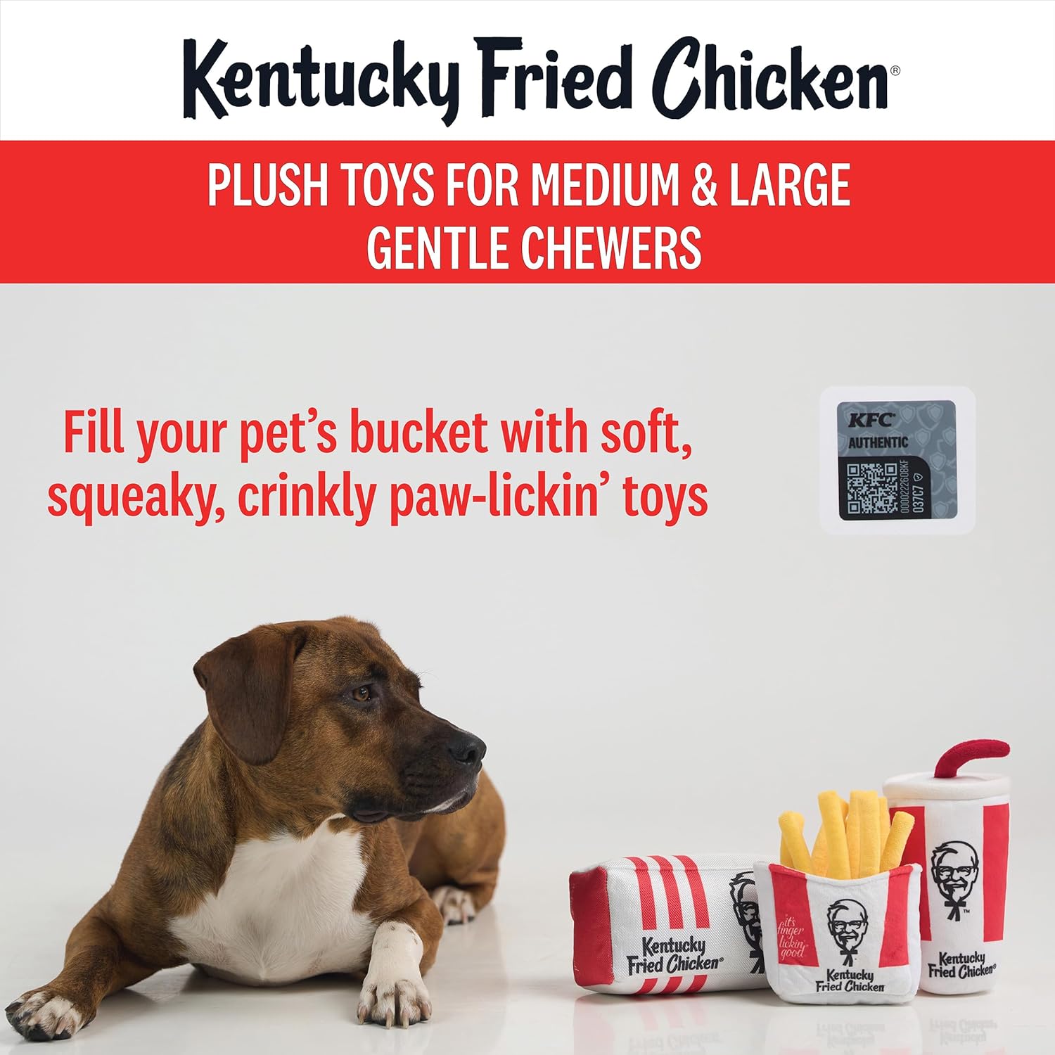 Treat your pup to the ultimate fast-food playtime with the KFC Dog Toy Set, featuring three officially licensed plush toys. This set includes a 5-inch French Fries, a 6-inch Soda cup, and a 7-inch Tenders Big Box, bringing KFC’s signature meal experience straight to your furry friend. Designed for medium-sized dogs, these toys are the perfect blend of interactive fun and cozy comfort. Each plush toy is designed with built-in crinkle material and a hidden squeaker, offering dual sensory stimulation to keep your dog engaged and entertained for hours. Whether they enjoy tossing, fetching, or snuggling, this toy set provides plenty of entertainment. Crafted with a soft, plush exterior, these toys are gentle on teeth and gums, making them ideal for light chewers. The lightweight design makes it easy for dogs to carry them around, ensuring a versatile play experience. While they are made with durable stitching, they are best suited for supervised play to extend their lifespan. For authenticity, each toy includes an official KFC licensing label and a QR code on the packaging, confirming it as a genuine Kentucky Fried Chicken product. Whether you’re looking for a fun gift for a dog-loving KFC fan or just want to treat your pup, this fast-food-themed toy set is a must-have!