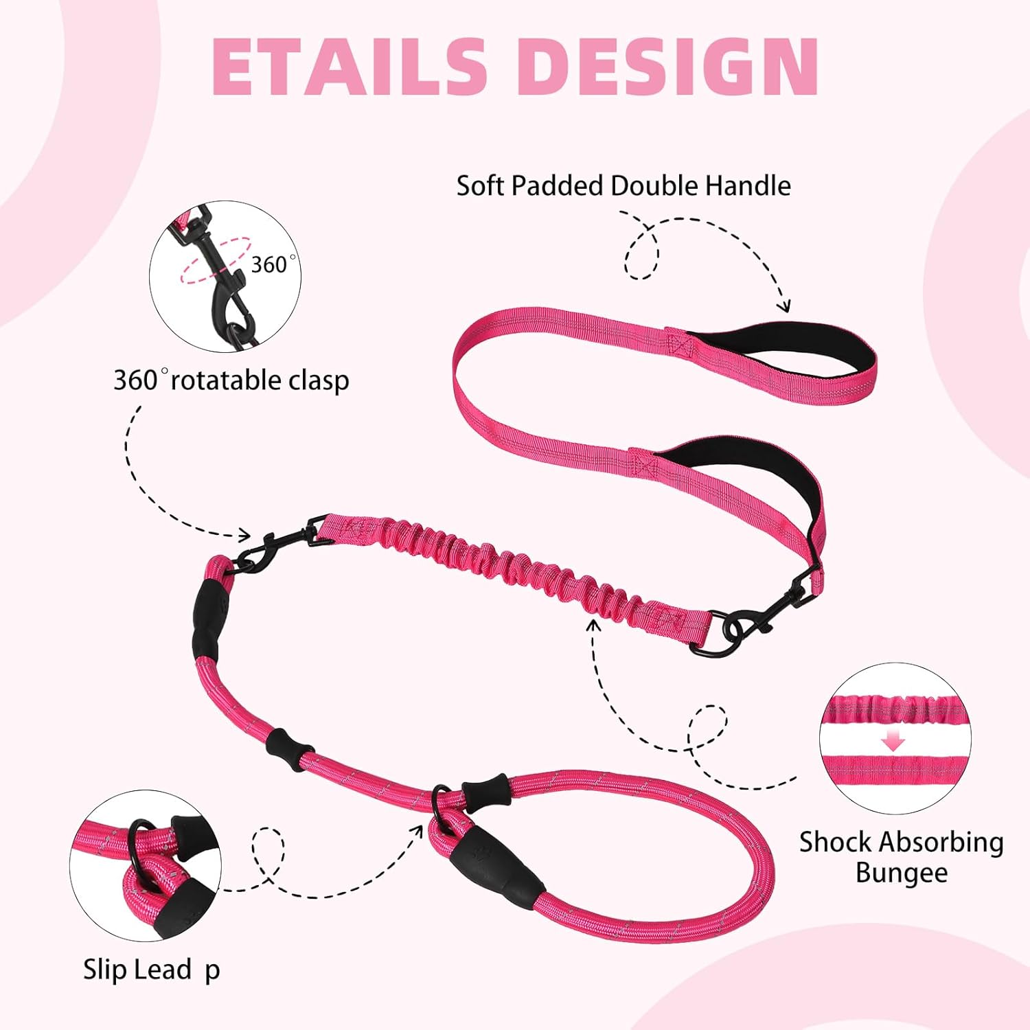 KOOLTAIL Slip Lead Dog Leash With Padded Double Handles, 6FT Heavy Duty No Pull Training, Reflective Removable Multiple Use Pet Bungee&Rope and Collar for Medium Large Dogs, Pink