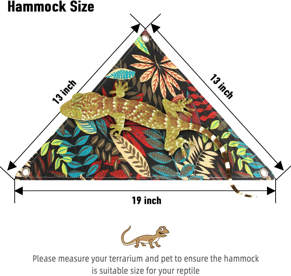 Triangular shape, side length is 15.7” x 15.7” x 19.7”, which is bigger than the other nest hammock on the market. Suitable for Bearded Dragons, Leopard Geckos, Lizard , Hermit Crabs Iguana or other small animals.