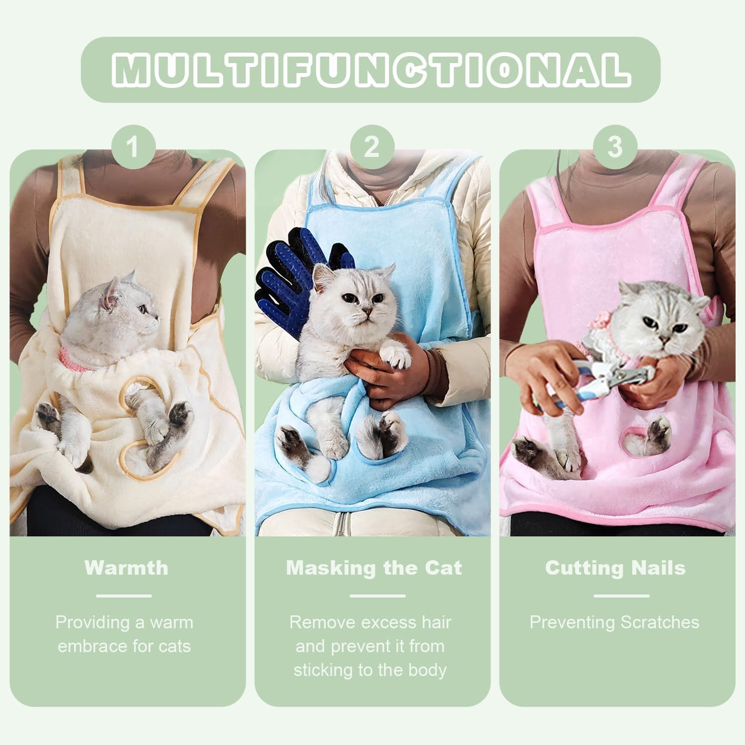 VERSATILE USE: The multi-functional apron not only allows you to freely get close to your cat and touch or hug it without worrying about your clothes getting stuck with the cat fur, but also makes it easier for you to trim your cat’s nails and wipe its face, preventing it from struggling and flailing. It’s also providing your cat with a large space to play with you without worrying about static