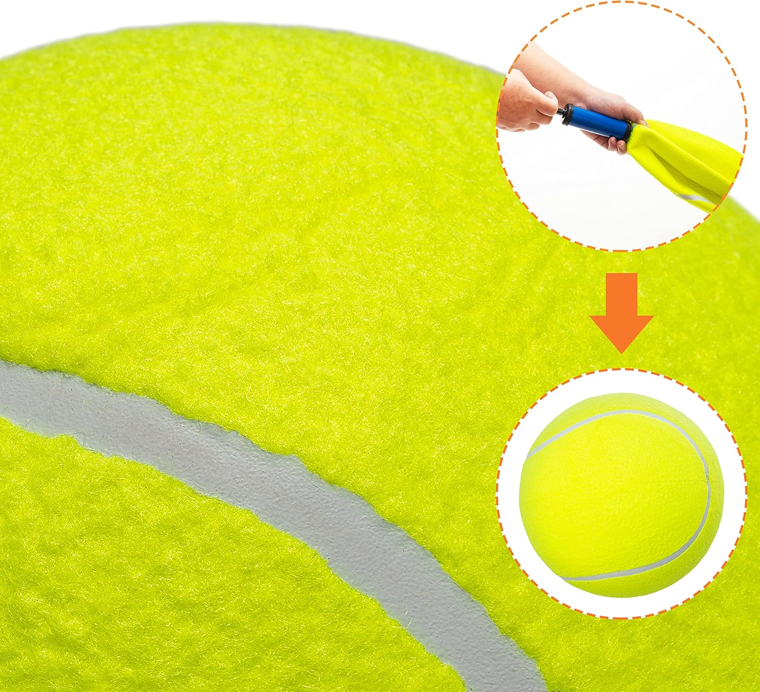 This is a funny giant dog tennis ball with a diameter of 9.5″, suitable for small, medium and large dogs to play. (Note: Due to the large size of the tennis ball, the product is packaged in a non-inflated state, with an air pump and air needle in the package, after receipt Please inflate yourself.)
