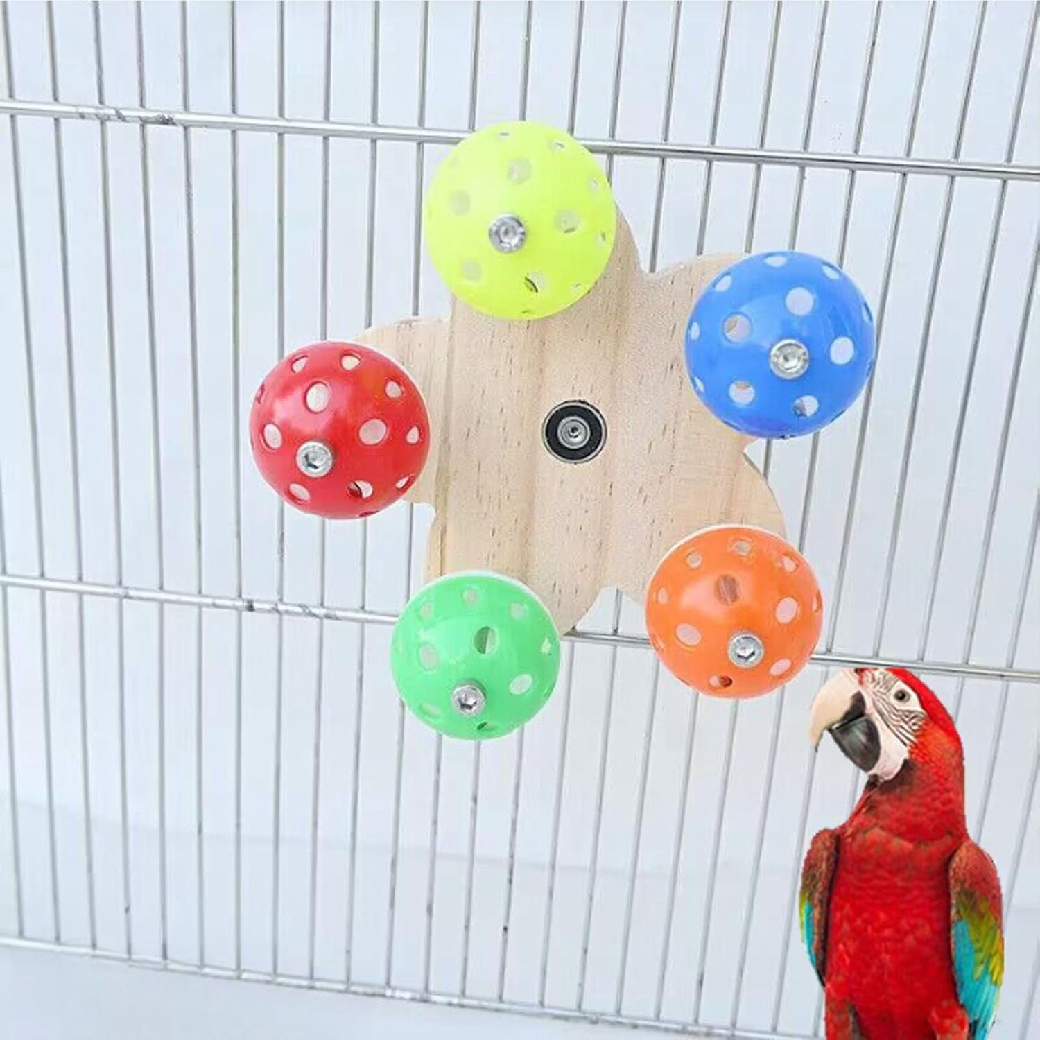 【Clear sound】the wheel is equipped with 5 bells of different colors, which emit a clear sound when rotating, bringing a pleasant feeling to the parrot, adding vitality and fun.