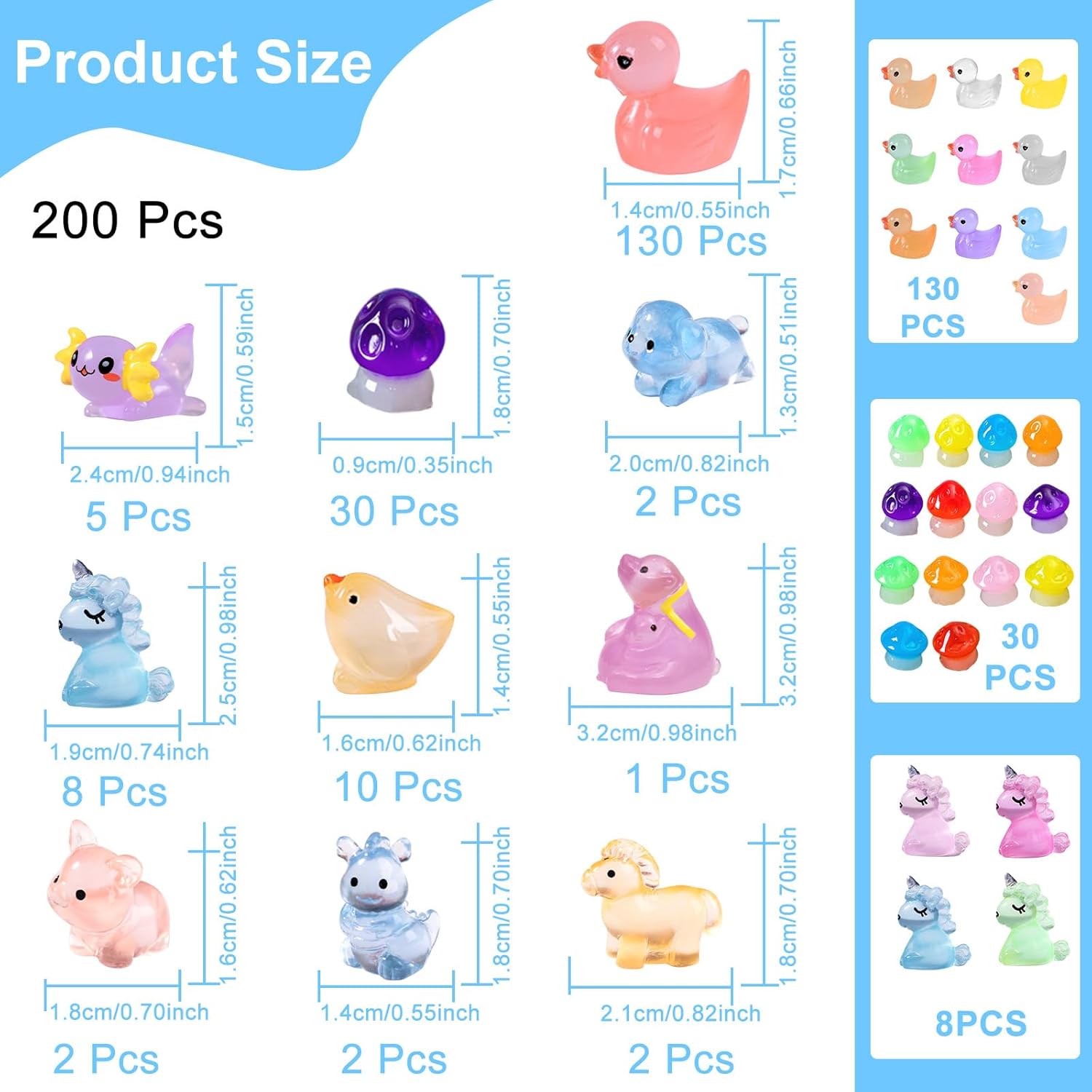 Value Package:You will get 200 pcs luminous mini resin animals:ducks,unicorns,axolot,chicks,mushrooms,polar bear,snakes,horses,pig,dragons,tigers,rabbits,rats,dogs etc. Bring a magical glow to your garden, aquarium or potted plants