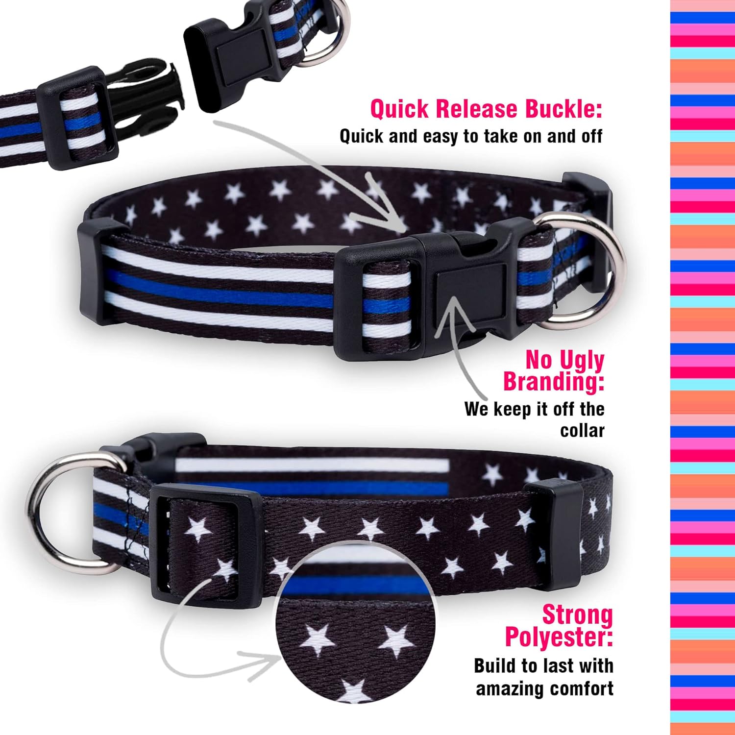 STRONG MATERIAL – From the smallest dogs to the biggest dogs…we got you covered. Our Thin Blue Line Dog Collars are made with strong material and buckles that stay clasped.