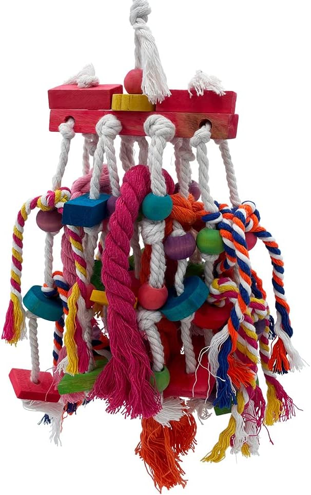 It is a chew toy with lots of distinctive colored wooden blocks and knots. It is made with 100% nature wood and food grade color material. They are 100% safe to all parrots. Parrots love to untie cotton rope knots, which satiates their instinctual urge to chew. This sturdy and durable toy is enough for small medium birds.