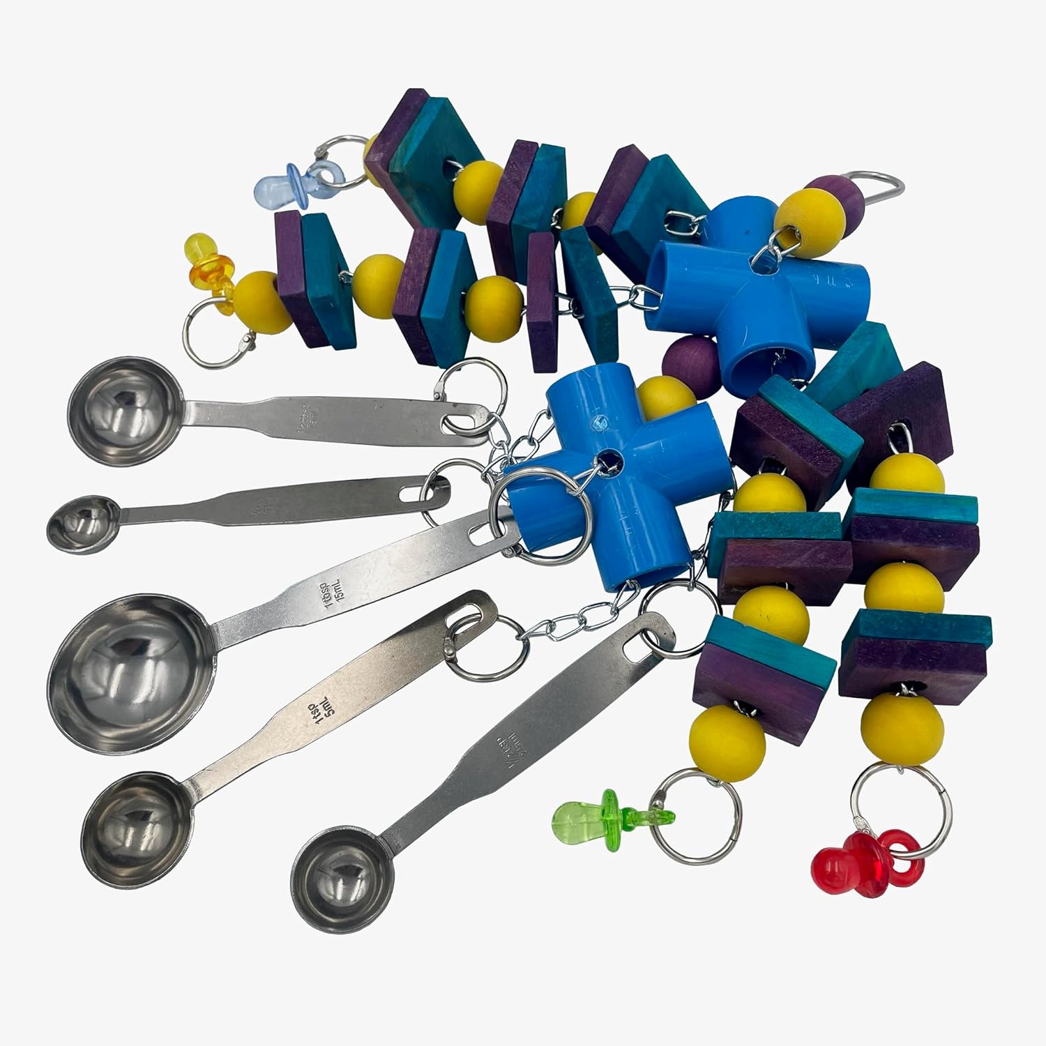 【Unique design】It consists of 5 stainless steel measuring scoops of different sizes and lots of multicolored wooden blocks and beads.The new upgraded chain and ring buckle make this toy more durable.