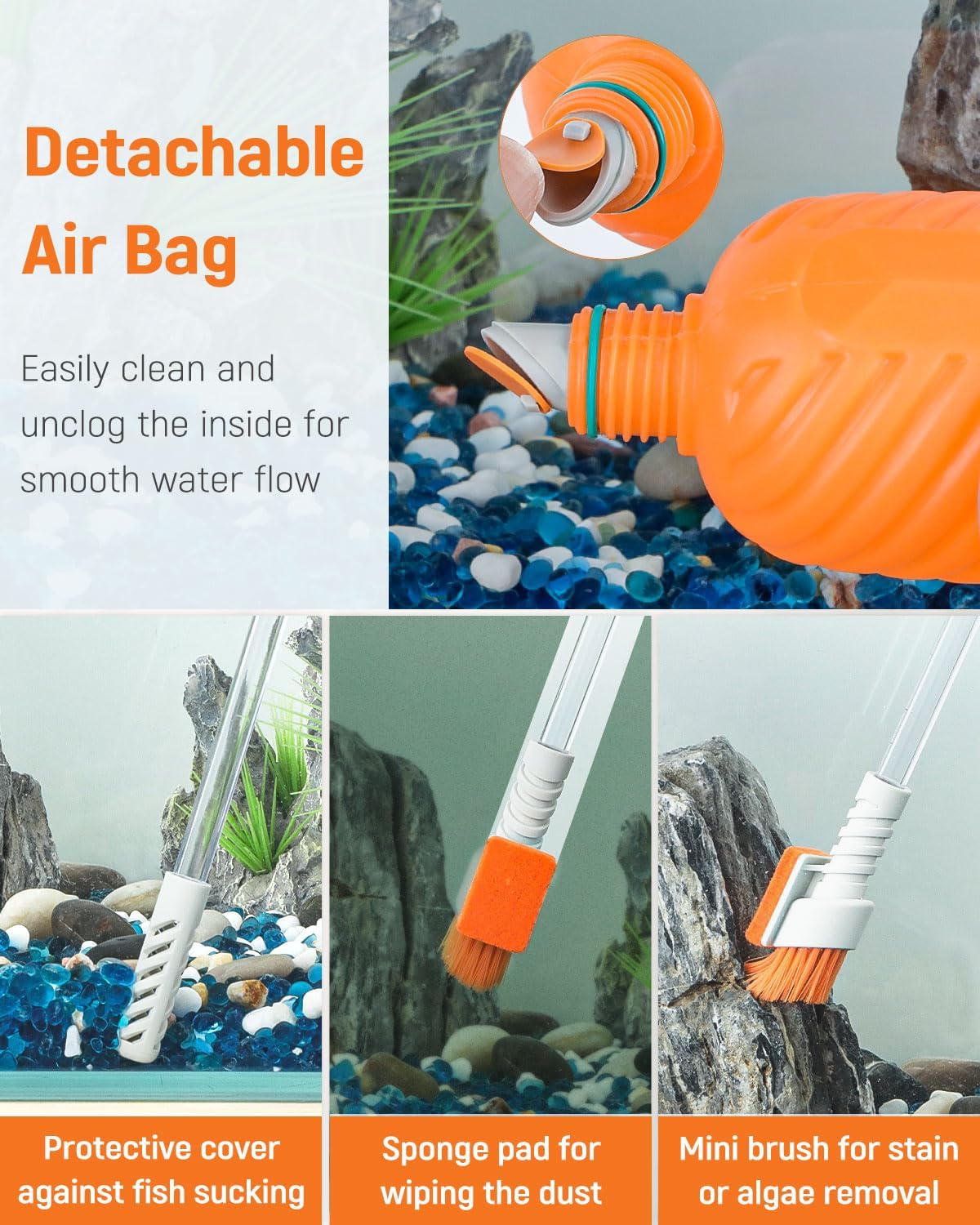 Reliable Material: The fish tank vacuum consists of clear PVC tubes and an EVA siphon ball with superb elasticity. Both ends of the air bag are detachable for easy cleaning and unclogging. No harm to your aquatic pets.