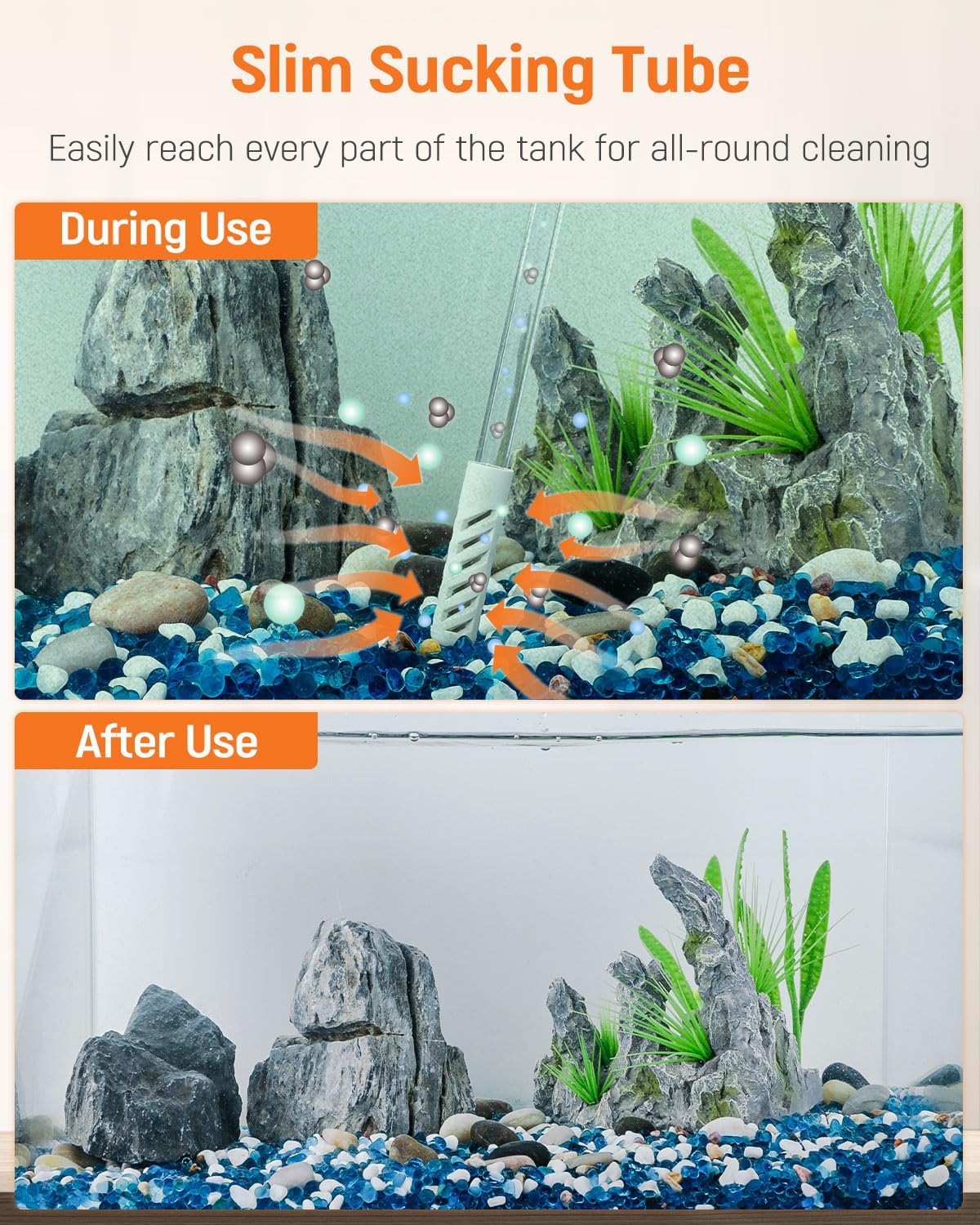 Reach Everywhere Easily: The sucking tube of the siphon vacuum cleaner has been greatly optimized to become stiffer and slimmer. Easily reach every corner or gap between rocks or plants. Quickly reach every part of the fish tank for all-round cleaning.