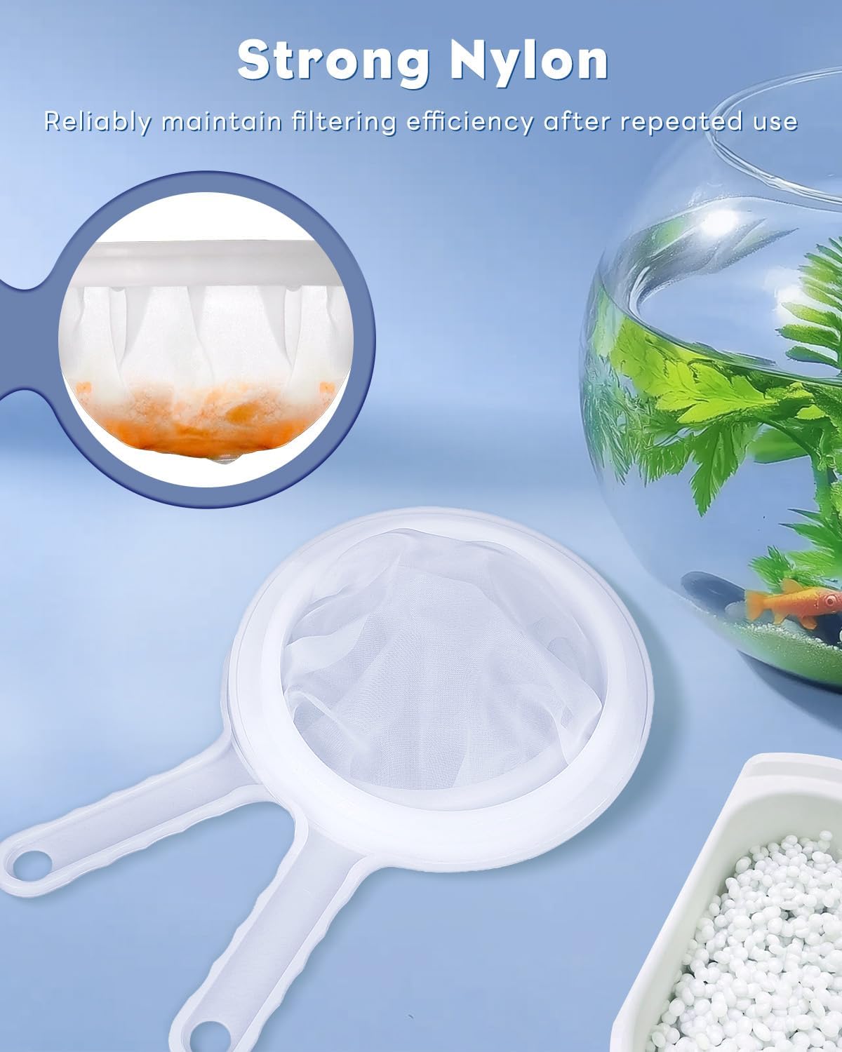 Fine Nylon Mesh: The well-stitched net is made of soft but strong nylon. Reliably maintain filtering efficiency through repeated use. Dense, needle-sized holes effectively catch any tiny nauplii. The finer the holes, the whiter the net