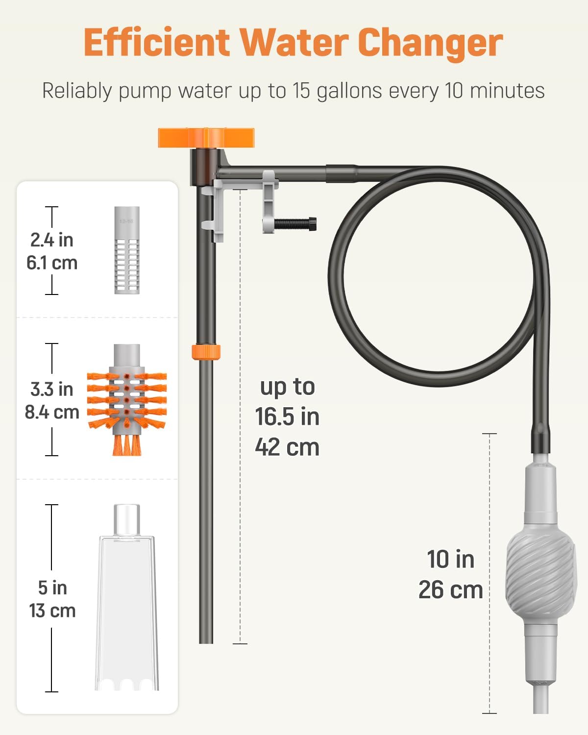 Reach Everywhere Easily: Featuring an extendable hard tubing, the water inlet tube of the aquarium gravel cleaner can be extended from 11″ to 16.5″. Effortlessly reach every corner of the tanks of different heights. Ideal for most aquariums and mini ponds