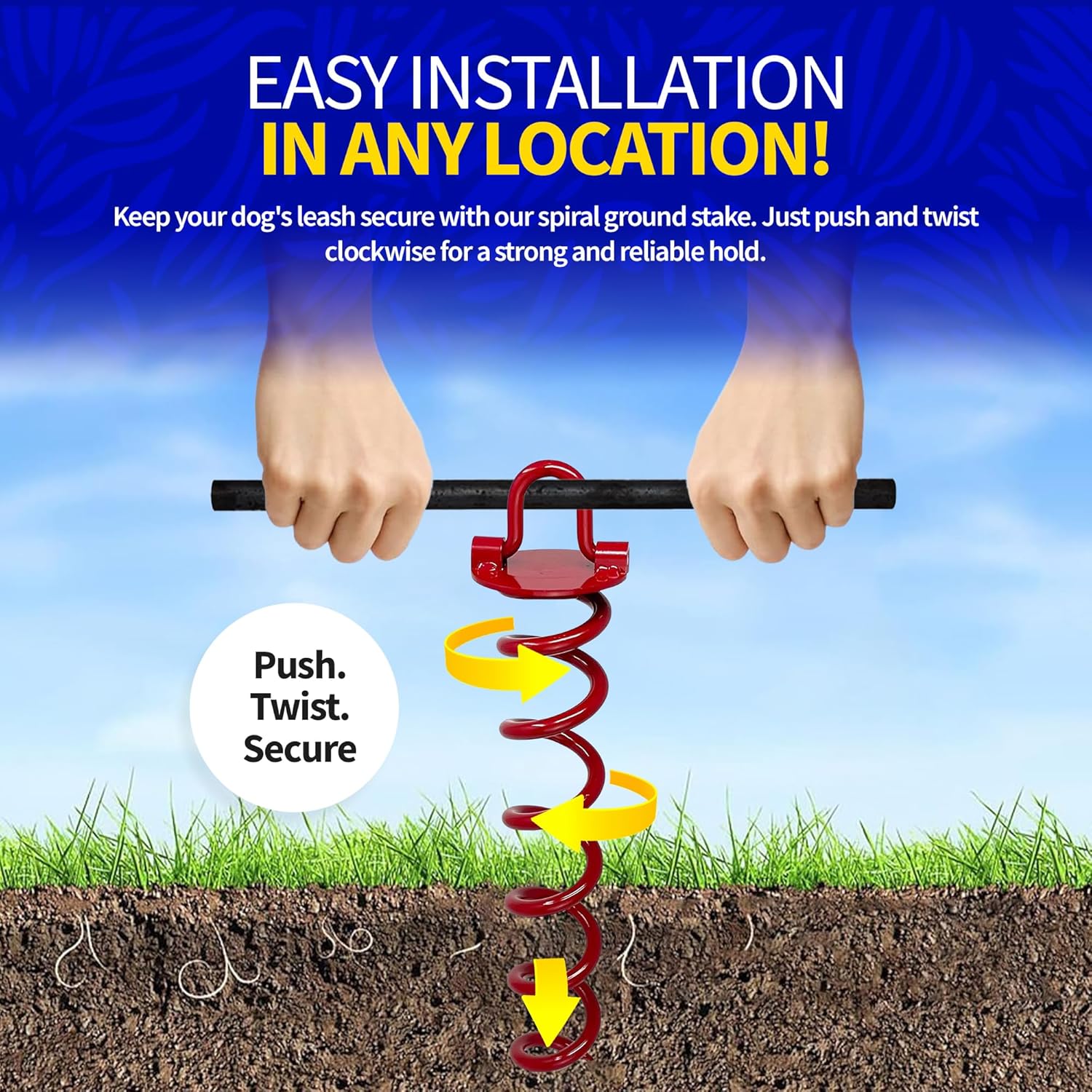 EASY INSTALLATION & SECURE ATTACHMENT – Our dog leash for outside yard is simple to set up—simply twist it into the ground and attach a dog cable tie-out or retractable dog tie-out cable for a firm, lasting hold. Designed for everyday use or travel, keeping your pup secure anywhere.