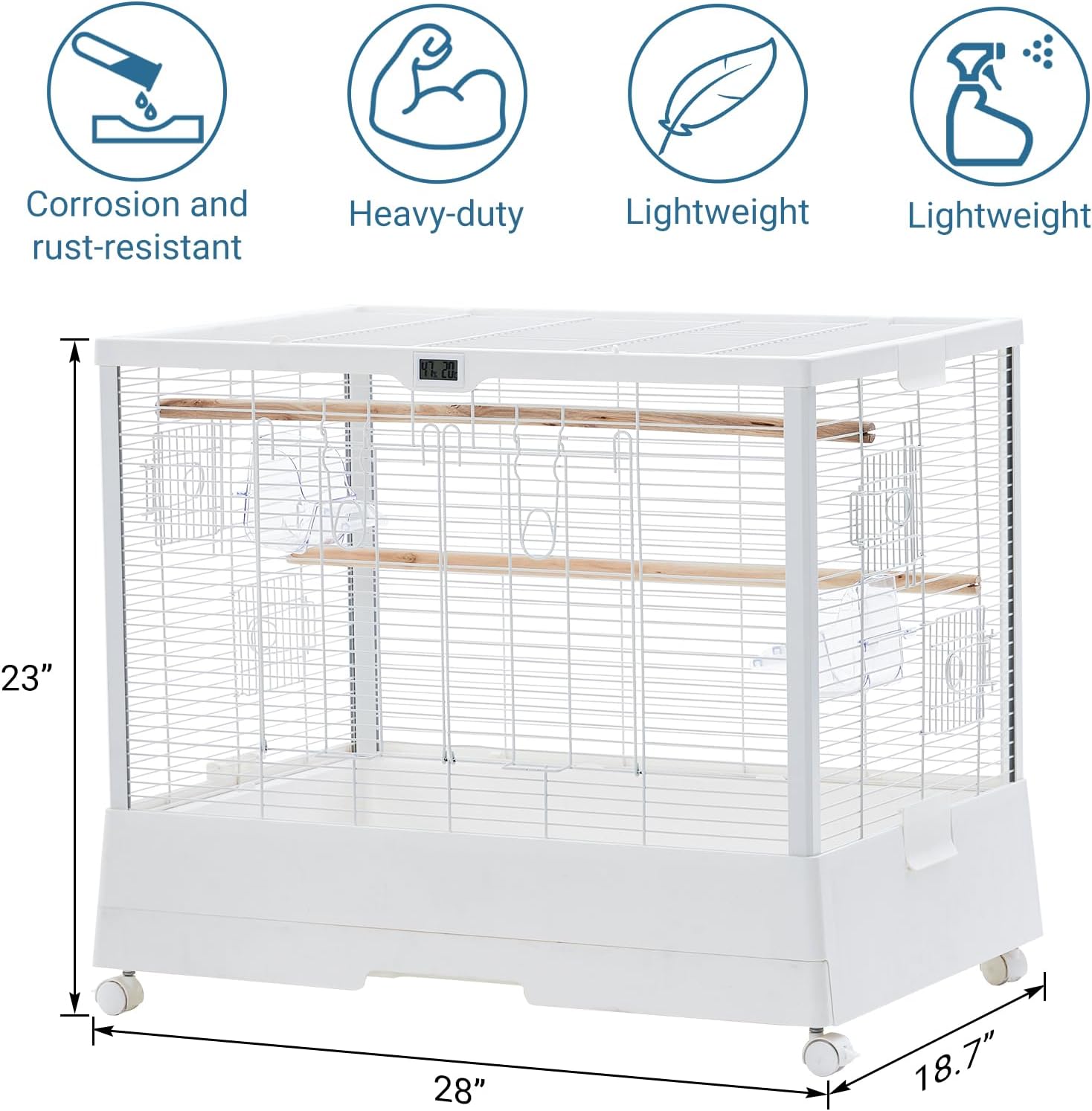 2 Feeders 2 Long Perches 4 360-degree caster wheels Detachable Tray Temperature and Humidity Detection