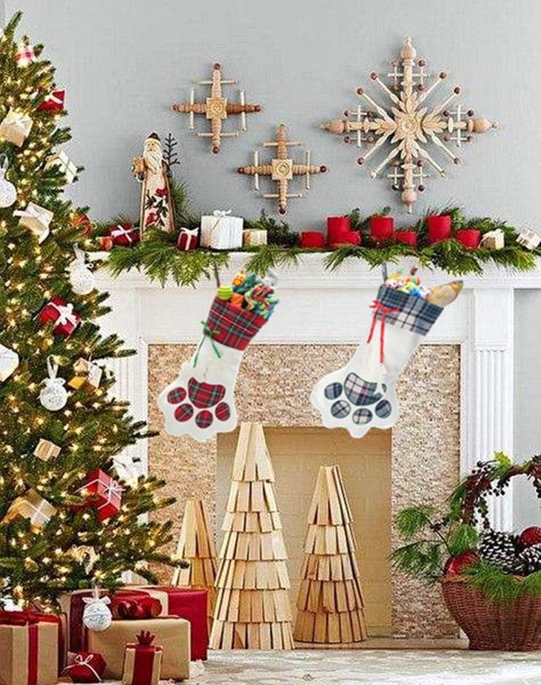 Special and refined design, plaid pet paw Christmas stockings decorated with Red and green bows, dog bone label and fish bone label.