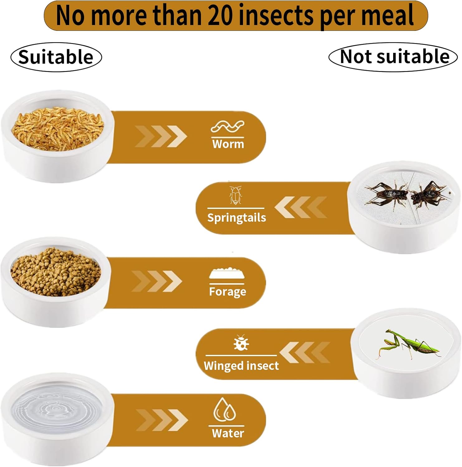 [Designed to Avoid Escape]Worm dish adopts an escape-proof inner curved wall design, a smooth inner surface will not hurt the crawlers and a wider inner curved wall to prevent feed from overflowing and make it easier for small and medium reptiles to eat or water. The designed to avoid escape is only suitable for crawling insects, not for jumping insects and winged insects
