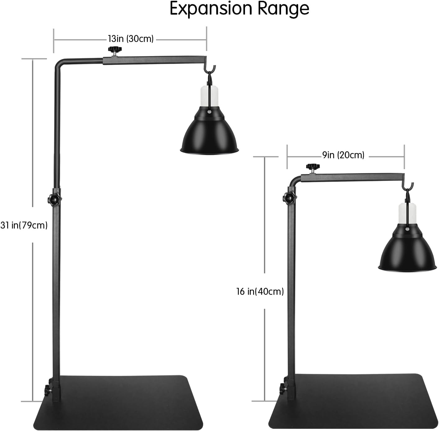 【Convenient and Free Adjustment】: This adjustable floor light bracket is retractable. The height adjustment range is 16-31inch. The adjustable range of the horizontal rod is 7.87-13.78inch. You can adjust the appropriate range according to the distance between the lamp and the reptile.