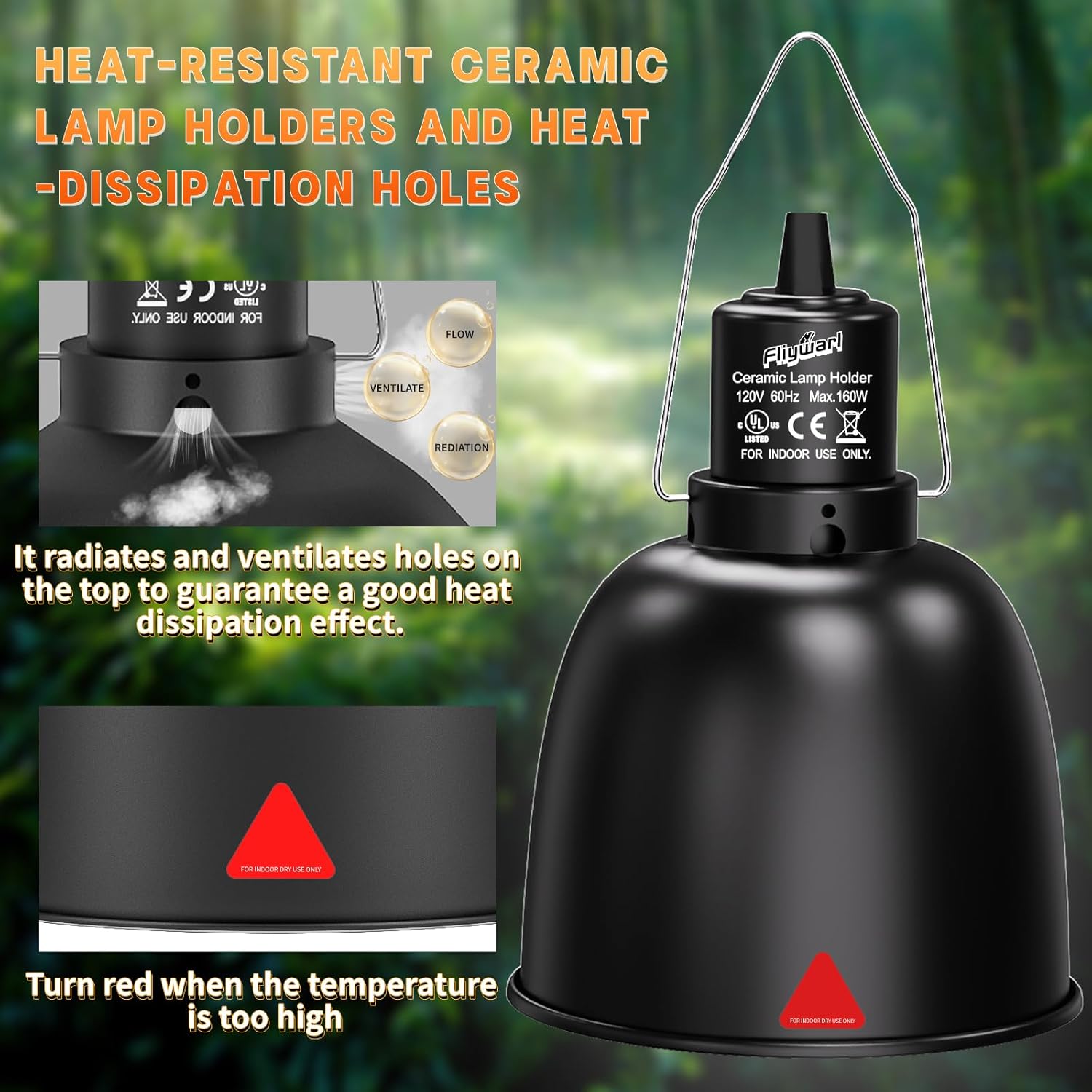 【Reptile Light Fixture】Fliywarl reptile light fixture with timed thermostats can conveniently manage your pet’s lighting and heating time. You can set a suitable temperature and timing according to your pet’s needs. The reptile fixture uses E26 ceramic lamp heads, which can withstand a maximum of 160W.