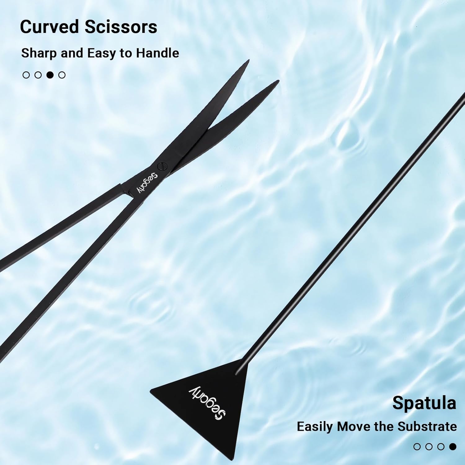 Segarty Longer Aquarium Aquascaping Tools, 4 in 1 Stainless Steel Black Aquarium Tools Kit for Aquatic Plant Fish Tank, Long Scraper Spatula Feeding Tweezers Curved Scissors Anti Rust Aquascape Set