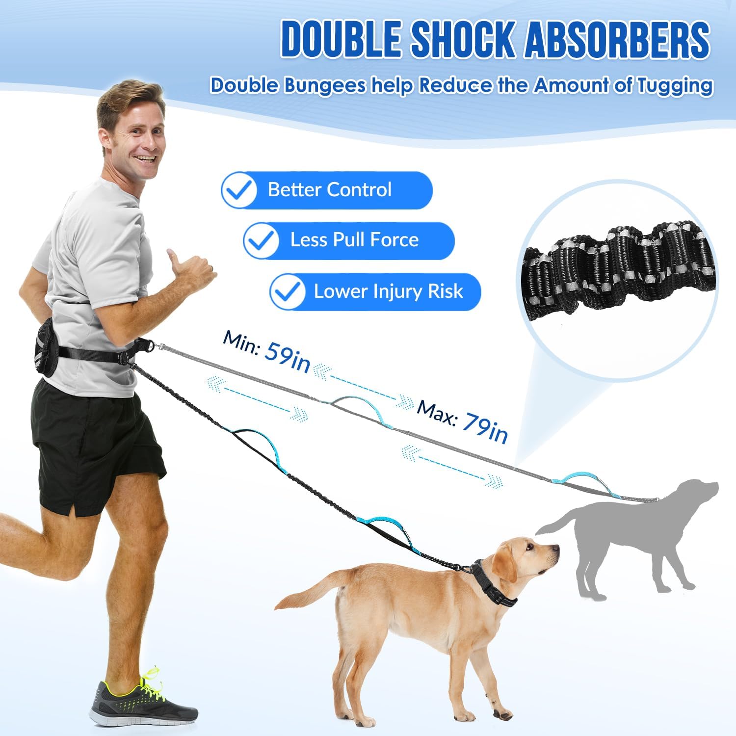 Adjustable & Hands-Free Design — Features an adjustable waist belt (24-48 inches) and a leash length of 59 inches (extendable to 79 inches), giving you and your dog freedom of movement while keeping your hands free for running, jogging, or hiking.