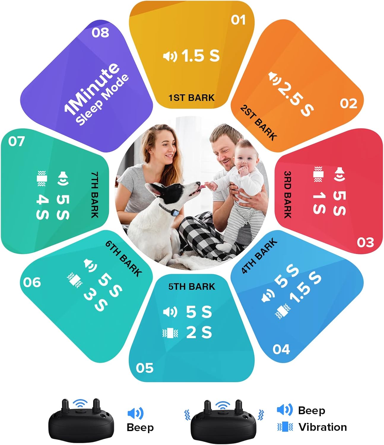 1st bark: progressive warning beeps for 1.5 seconds2nd bark: progressive warning beeps for 2.5 seconds3rd bark: Sound for 4 seconds+vibration for 0.5 seconds4th bark: Sound for 4 seconds+vibration for 1 seconds5th bark: Sound for 4 seconds+vibration for 1.5 seconds6th bark: Sound for 4 seconds+vibration for 2 seconds7th bark: Sound for 4 seconds+vibration for 2.5 seconds8th bark: 1 minute sleep mode