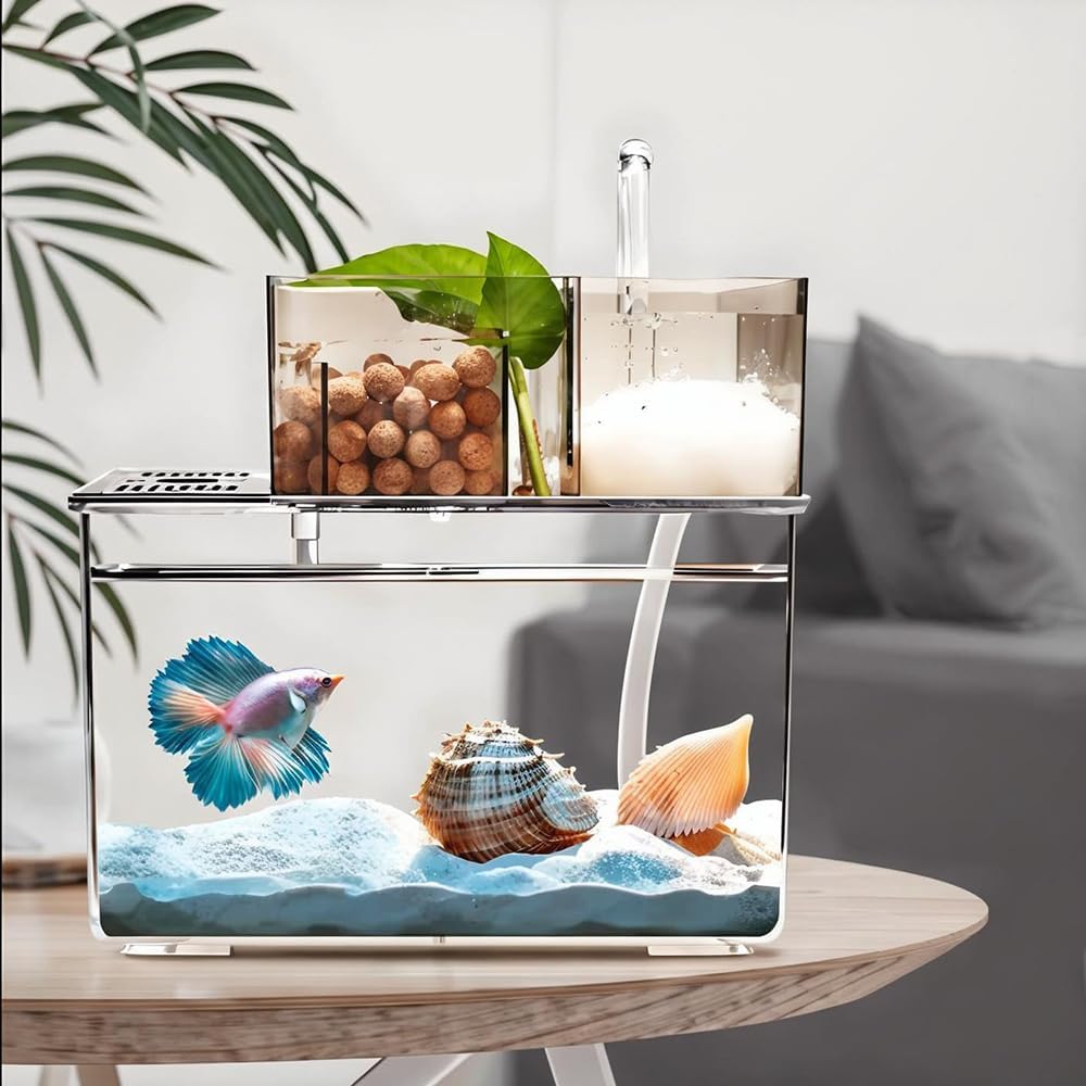 Small Fish Tank with Filter, Self Cleaning Betta Fish Tank, with Bottom Suction Silent Water Pump – Ideal for Desktop Aquariums