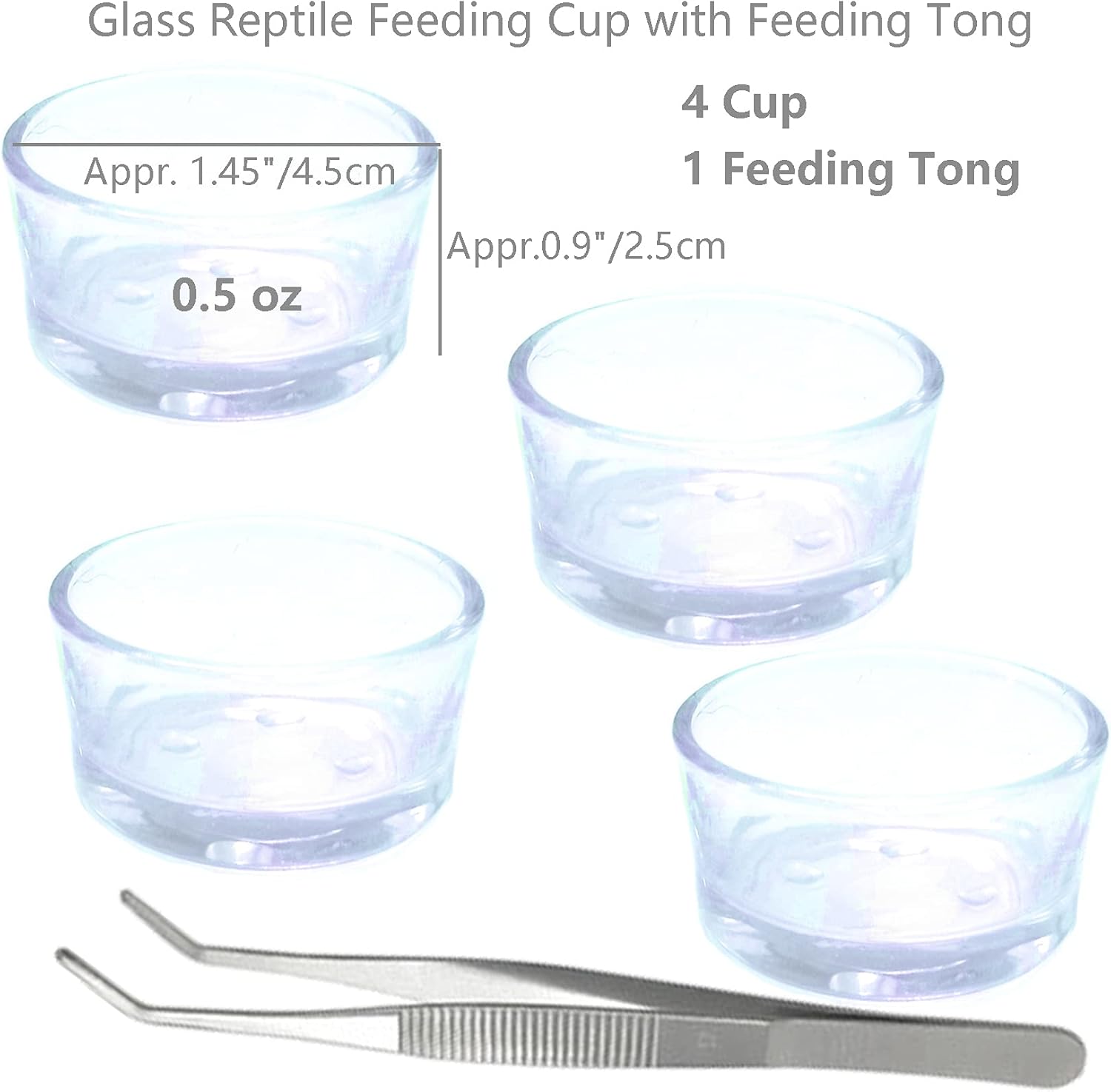 Small gecko feeding cup, 4 pieces, 1 feeding tong. Feeding Tong made of 430 steel has a certain anti-rust ability but still needs to be cleaned and dried after use.