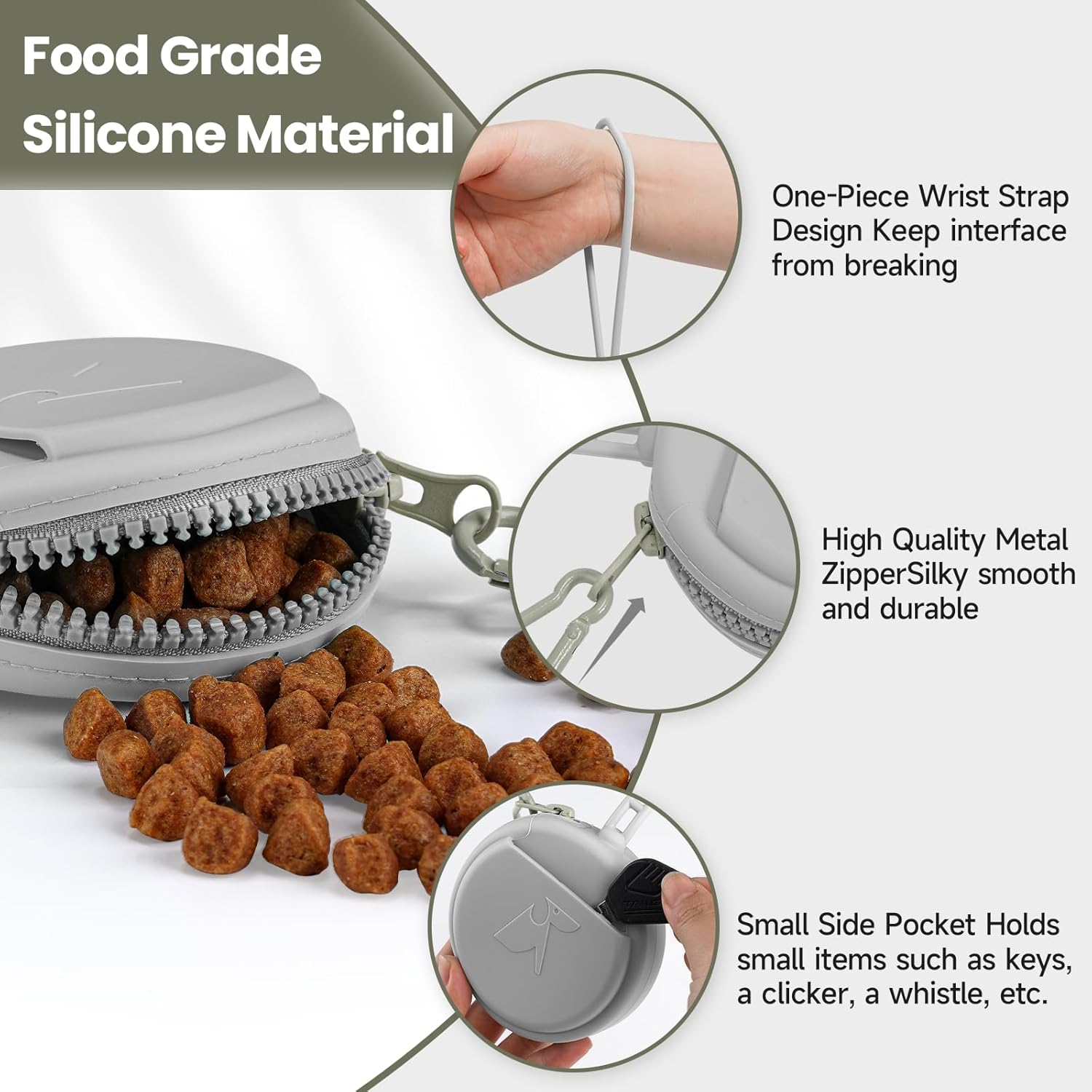 Small Silicone Dog Treat Pouch with Pet Training Clicker, Durable Metal Zipper, Integrated Strap, Mini Portable Size, Easy to Clean, Odorless, Travel Walking Bag for Leash (Grey)