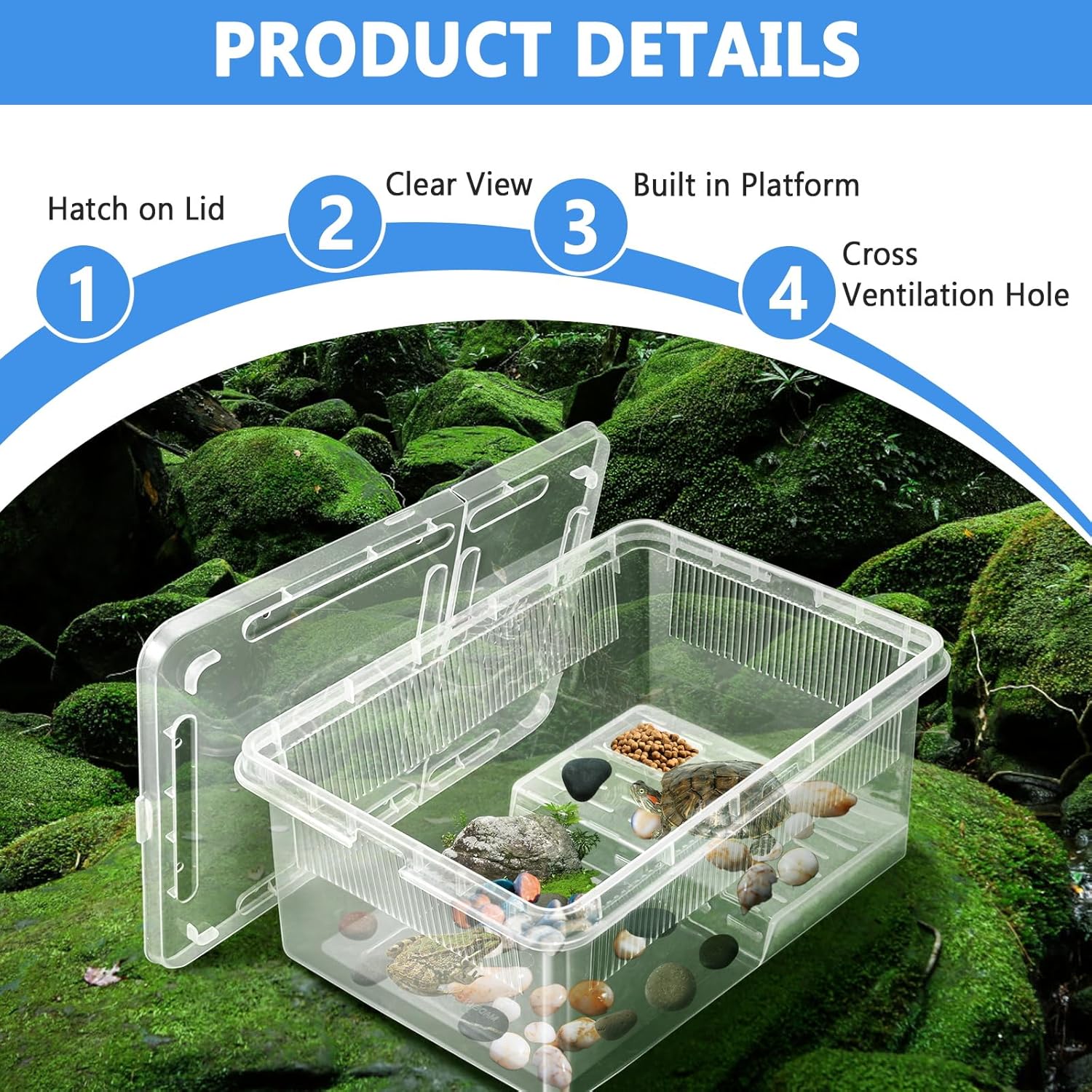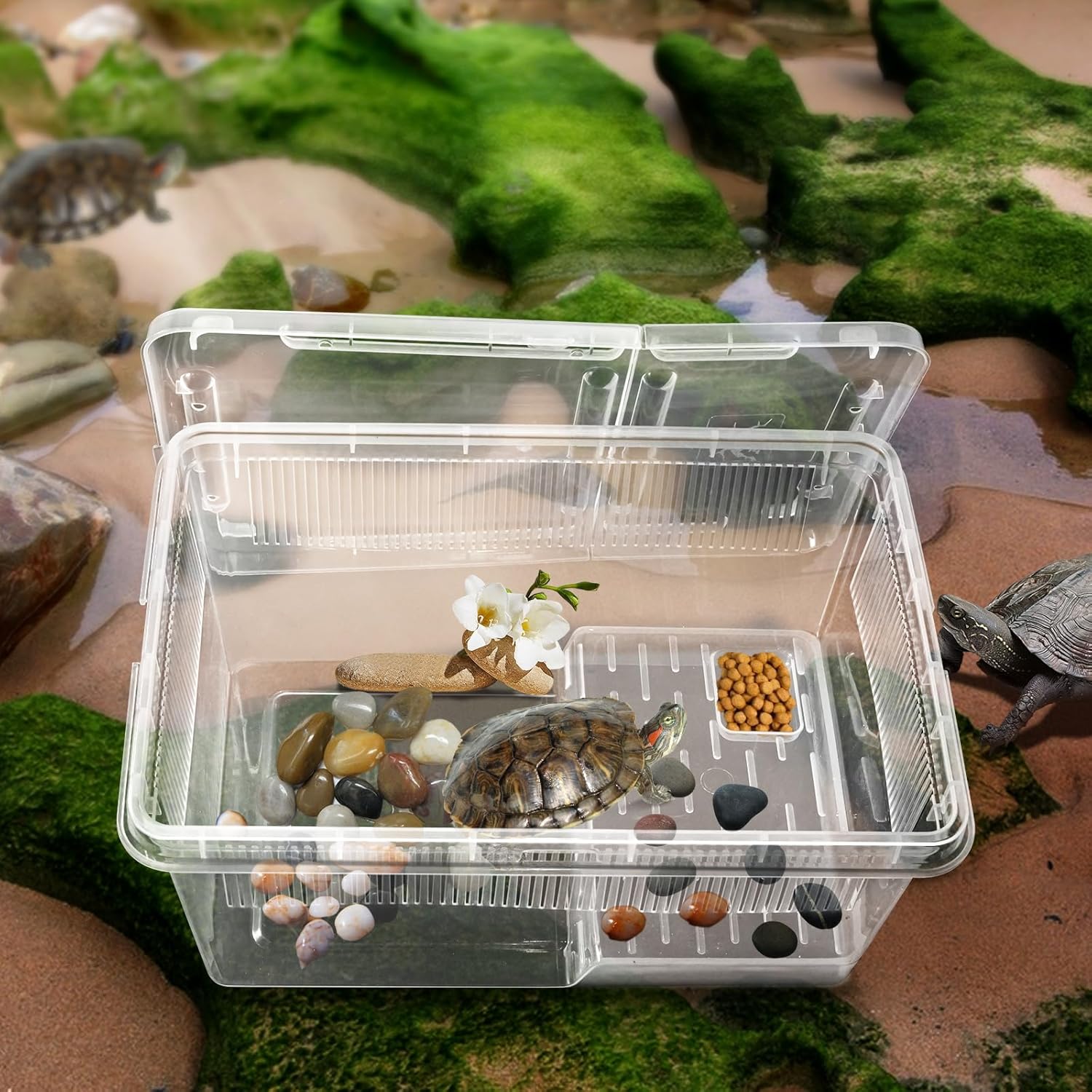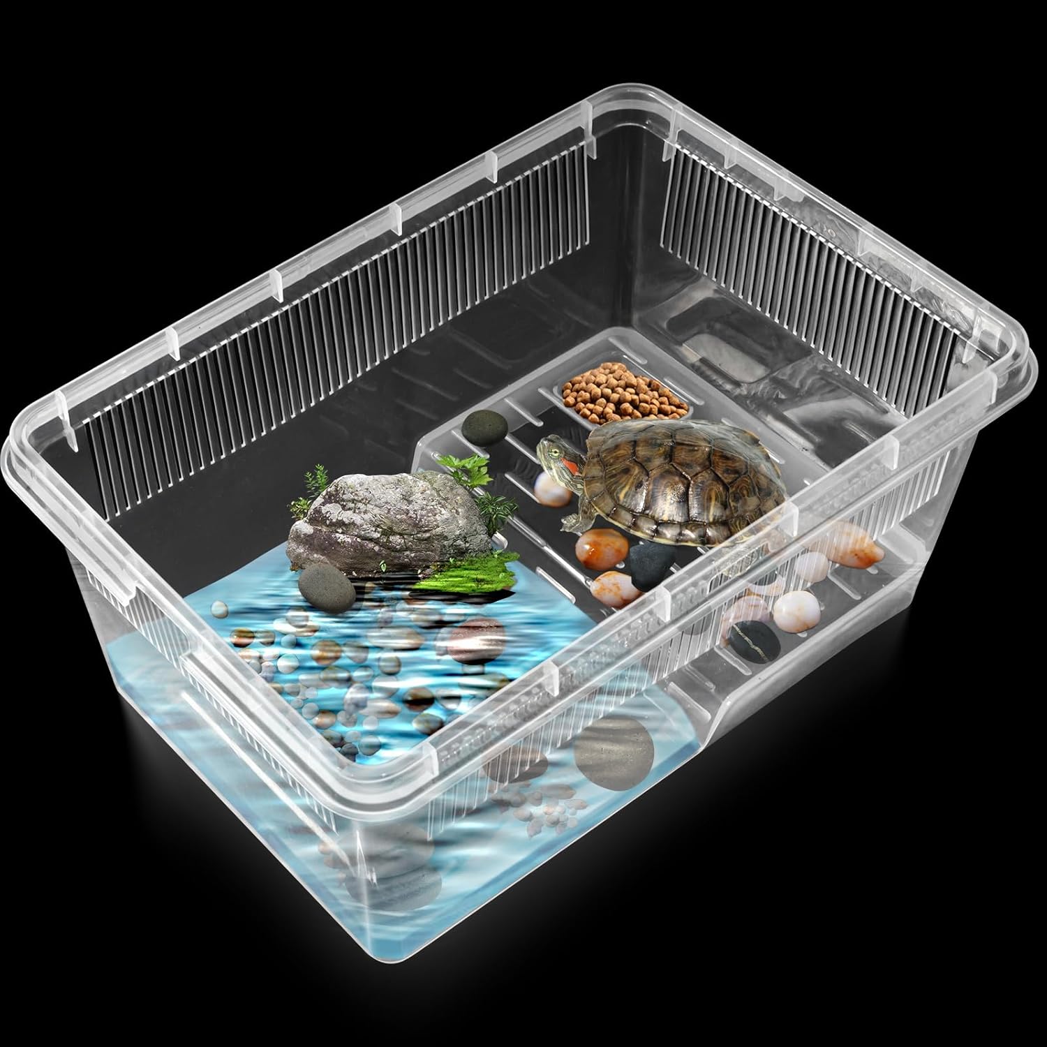 Compact Size: Measures 10.6×7.5×4.6 inches. The turtle aquarium is suitable use indoors or take on the go.