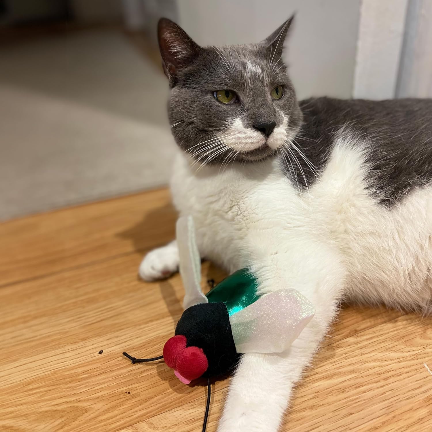 Cats will love chasing these jumbo-sized bussing insects! Realistic buzzing sounds and bright colorful designs will attract cats to bat and swat all day. A mixture of textures will offer something for every cat. Buzzing insects are touch activated and include a catnip/silver vine blend.