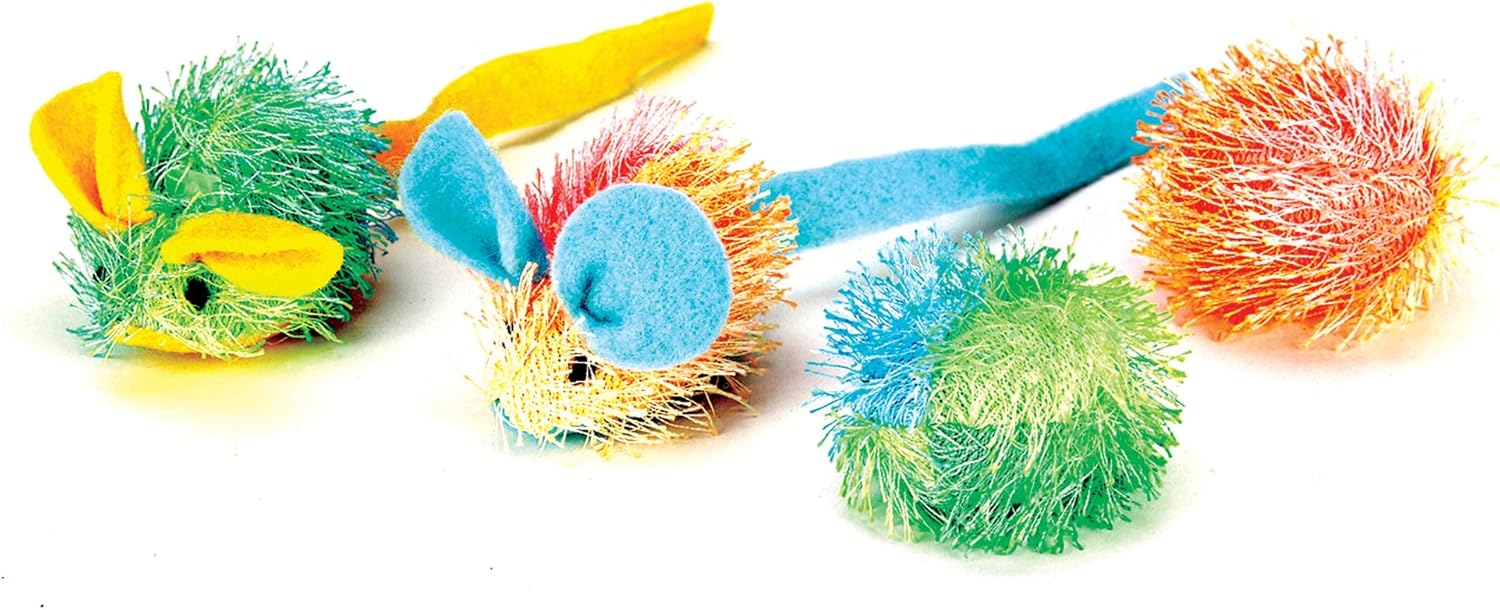 Pack of four 2″ toys, including 2 mice and 2 balls in assorted colors