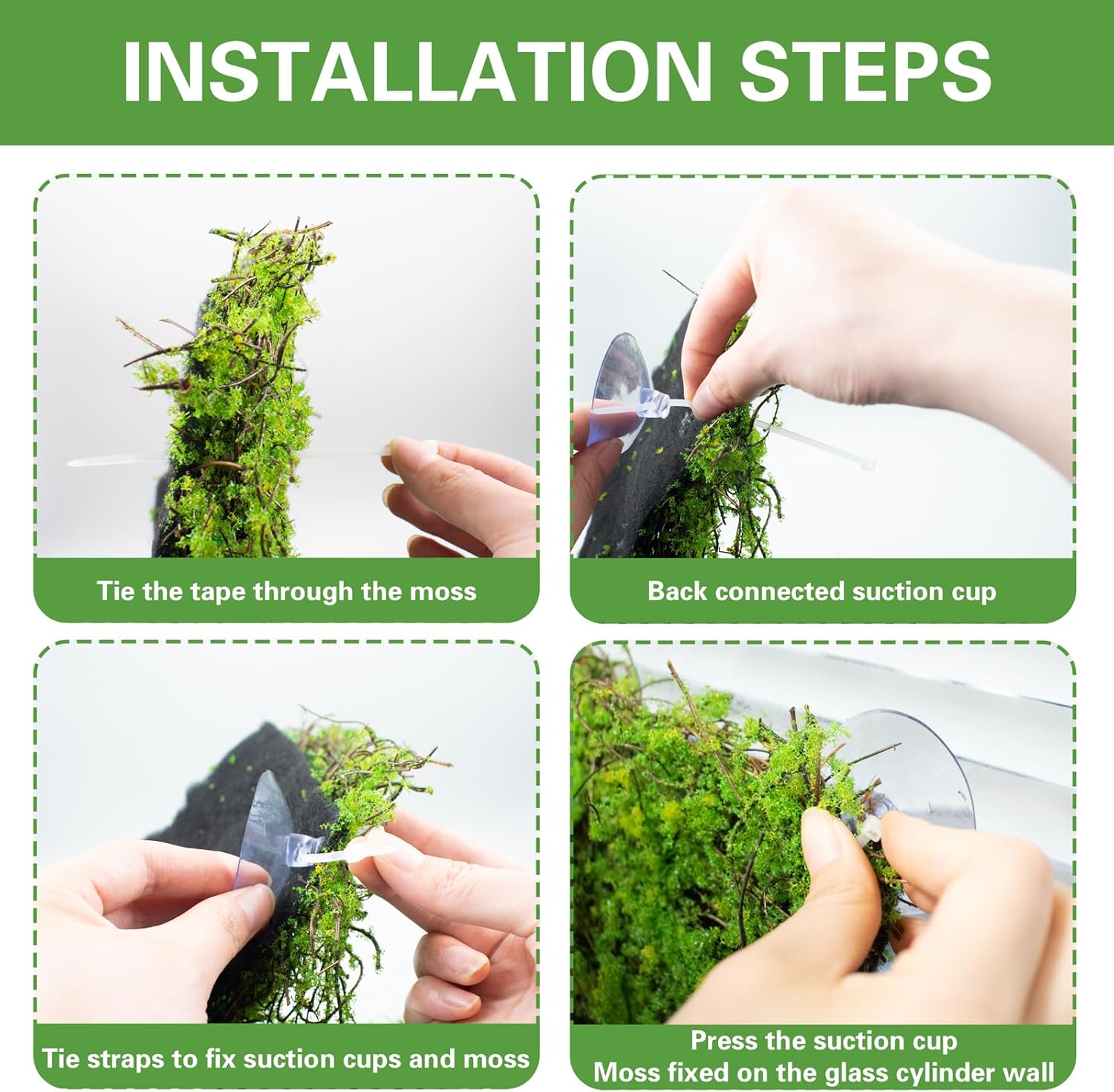 Easy Installation: With 12 suction cups and 12 cable ties included, our moss background can be effortlessly attached to the glass, instantly enhancing the aesthetic appeal of your terrarium. Bring the beauty of the rainforest to your reptile habitat with ease.