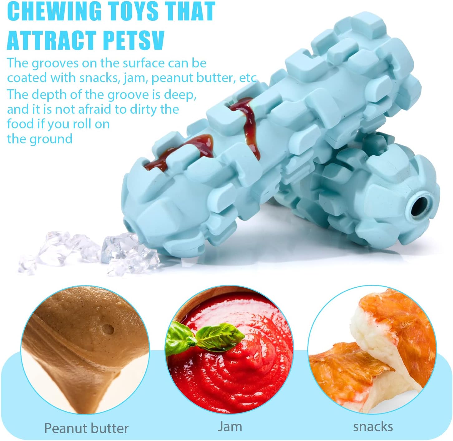 【Unique Design】The durable dog toys for aggressive chewers Popsicle adopting 3D particles design .Newest toothbrush stick dog toy is designed center hollowing and bottom sealed, you can pour water or milk in and freeze it in the refrigerator, frozen liquid bring enough cooling while your dog chew it, unlock the new gameplay of ice lolly for your pet especially during summer hot days.