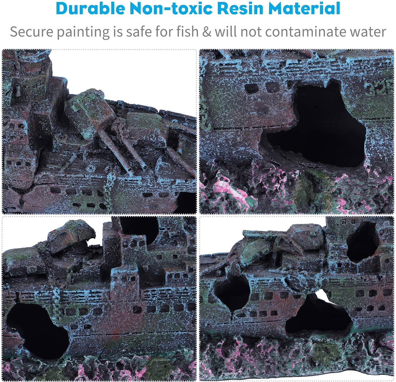 Uniclife resin sunken ship ornament is great for 5-30 gallon fish tank. Made of premium resin and the paint is solid. Suitable for tiny fish chasing each other through the holes and a perfect tight space for a few skittish fish who like to hide.