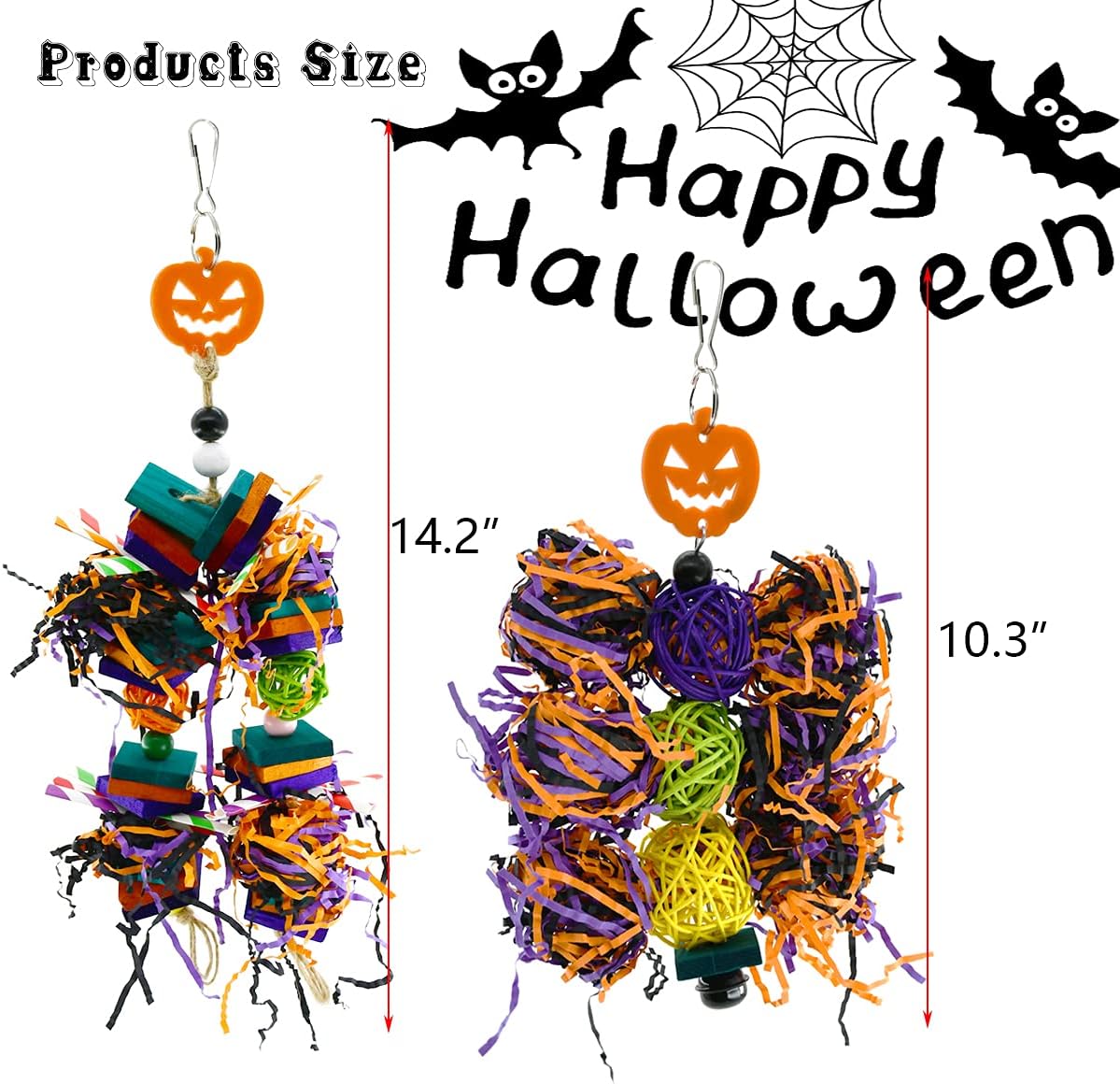 – Materials: Our bird halloween toys are made of natural rattan, pine wood blocks, decorated with acrylic pumpkin faces, and stuffed with brightly crinkly papers by handmade, safe to chew.